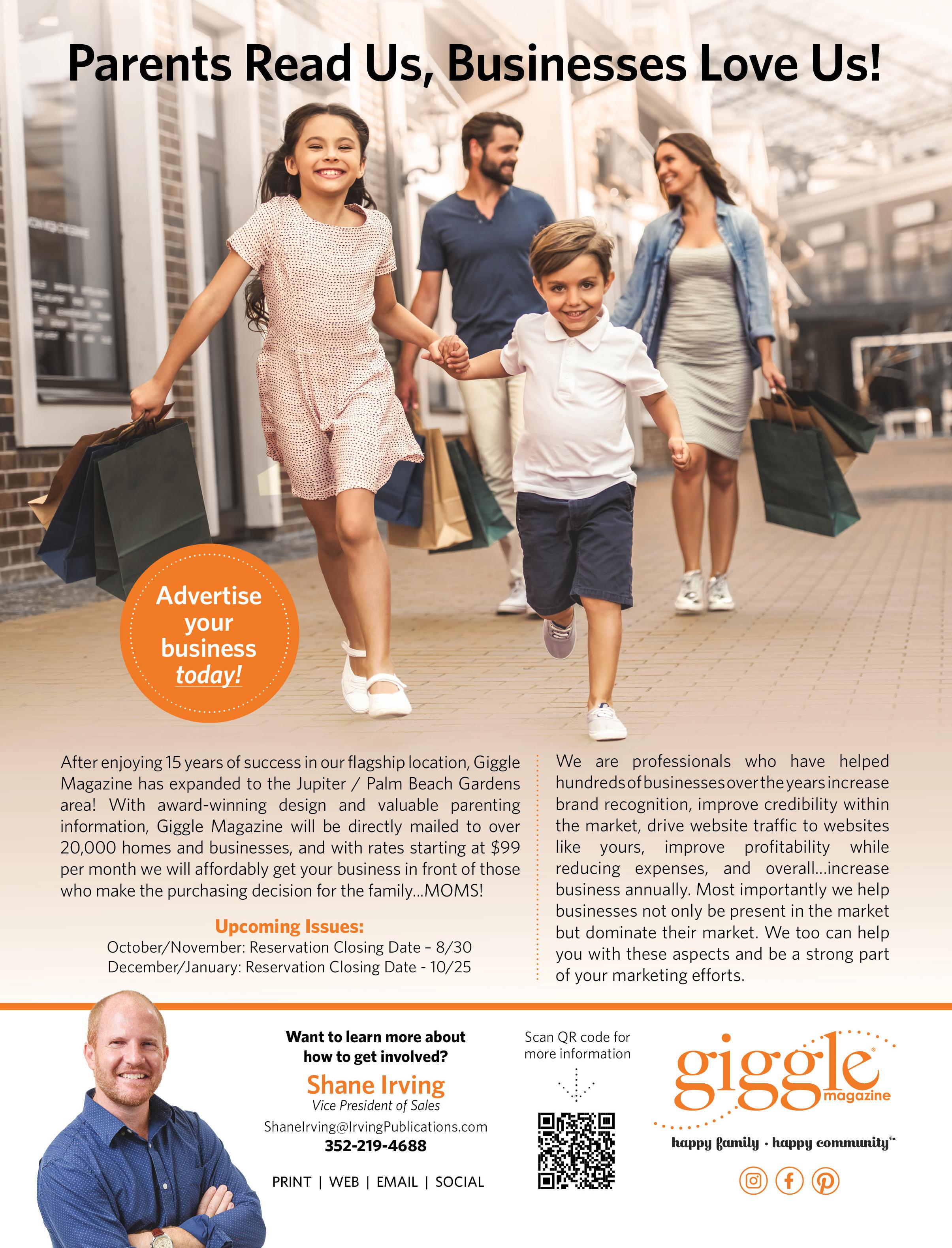 For more information on advertising with Giggle Magazine, please visit irvingpublications.com, call 352.505.5821 or email shaneirving@irvingpublications.com.