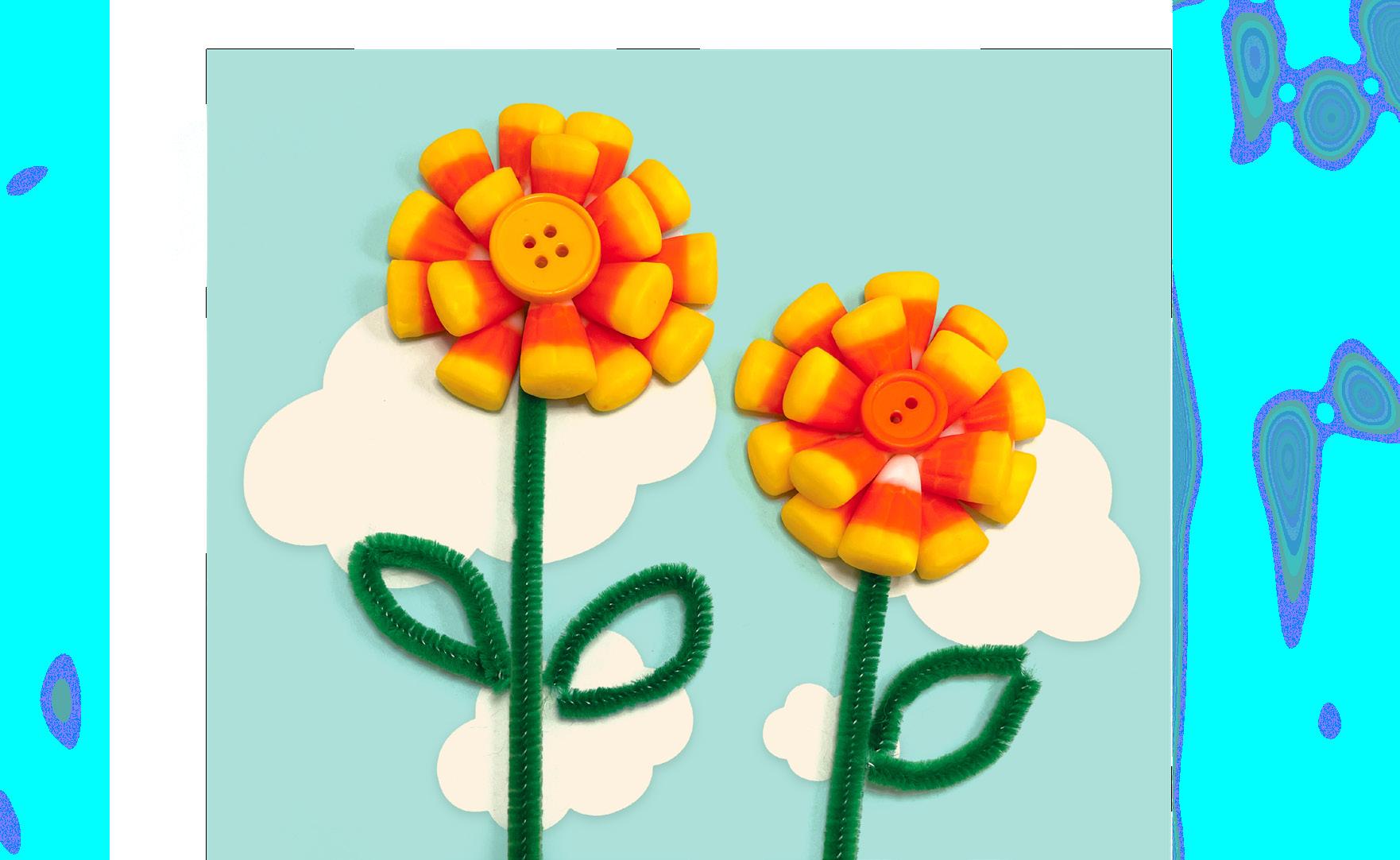 A non-edible treat is just as fun. Use the festive corn to make crafty flowers. Get a piece of construction paper, green pipe cleaners, orange or yellow buttons, candy corn and glue. Glue the pipe cleaner and button to the paper. The button (the middle of the flower) should be right above the pipe cleaner (the stem). Then glue the candy corn pieces around the button with the white sides touching the button so that they look like petals. Hang up their artwork or give it to a friend or family member as a gift!
