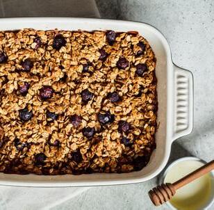 Mix rolled oats with milk, eggs a bit of honey, and your favorite spices, then bake in the oven with fruit or nuts. Slice it into bars for a portable breakfast option.