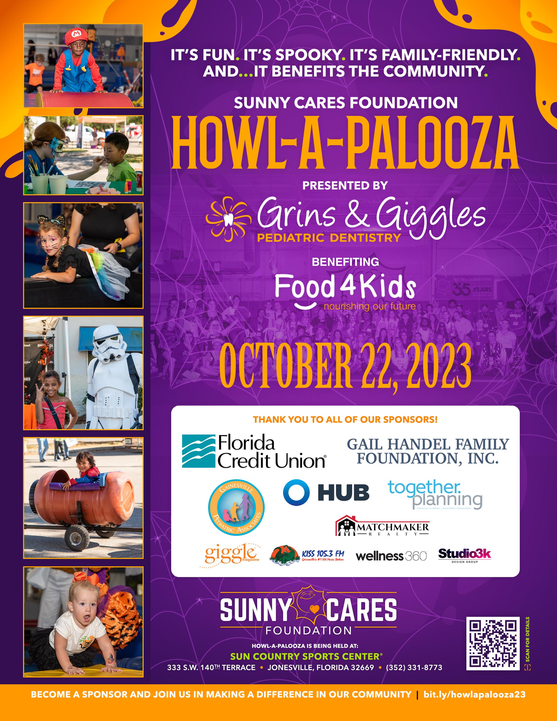 There will be carnival games, bounce houses, rock climbing, kiddie haunted house, train rides, face painting, obstacle courses, ninja fun and more. Goody bags and prizes will be given to all children. Proceeds will benefit the Food4Kids Backpack Program of North Florida, and The UF Cancer Research Center in memory of Linda Bennett.