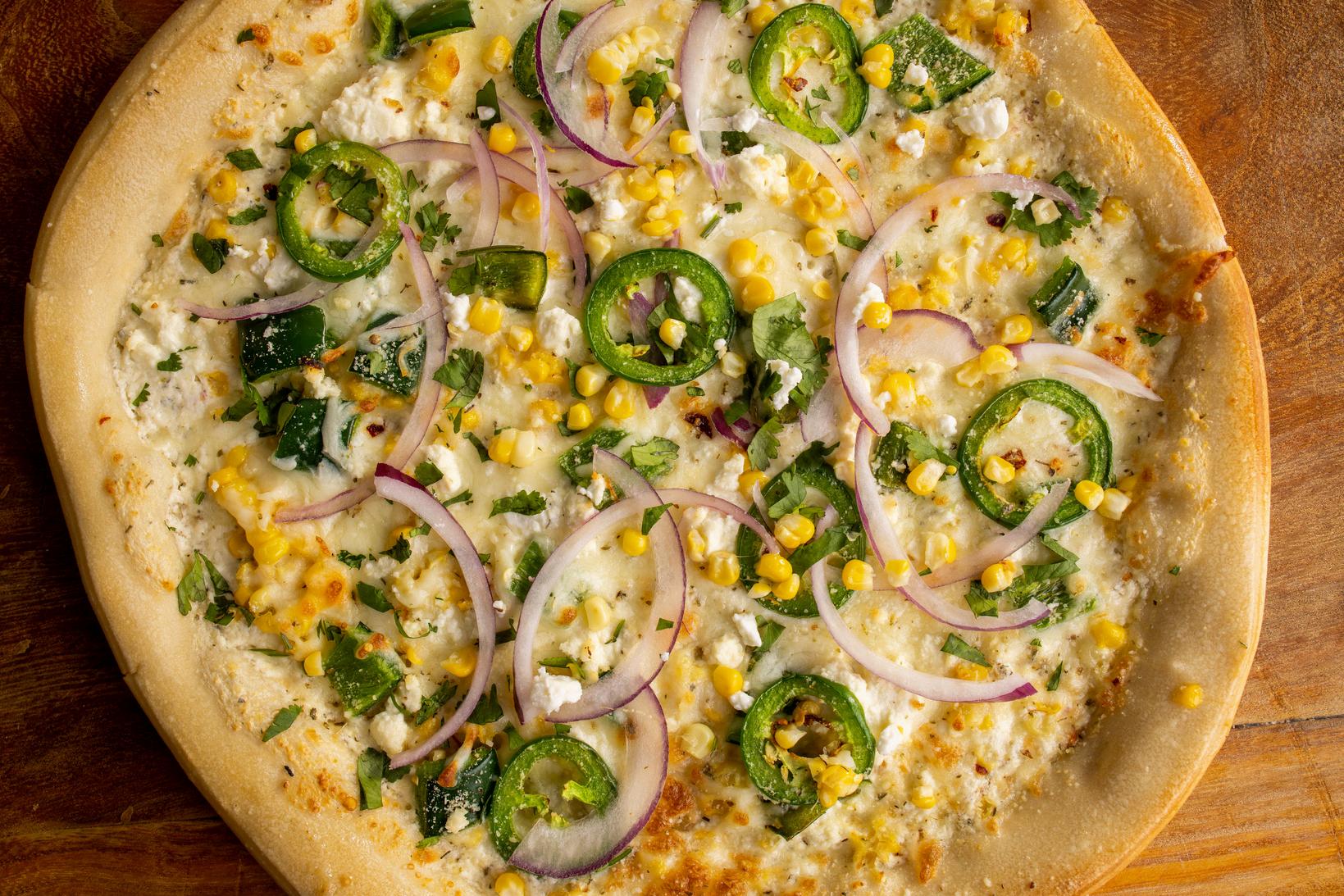 Mexican Street Corn and White ‘Shroom Pizzas are unexpected and crowd-pleasing. They add variety without adding meat.