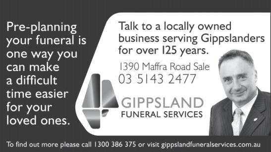 & MAFFRA SPECTATOR Times PropertyGuideGippslandTimesINSIDEFriday Showers- Min: 12 Max: 21Thursday Showerseasing -Min:11Max: 22Wednesday Showers-Min: 10 Max: 17WEATHER 74 Macalister Street, Sale TUESDAY,4OCTOBER, 2022 www.gippslandtimes.com.au Tel: 03 5143 9333 $1.70Inc. GST AUSTRALIA DAY AWARDS LETTER GRAMMAR REUNION SMCA REVIEW PAGE 7 PAGE 8