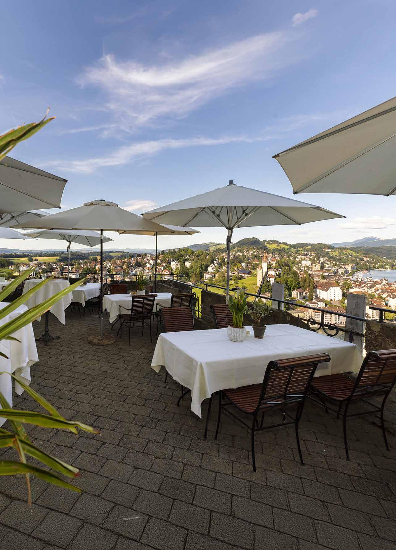 Die Terrasse ist bei schönem Wetter täglich geöffnet. Ideal für ein entspanntes Mittagessen, einen Apéro oder ein Dinner mit Aussicht.