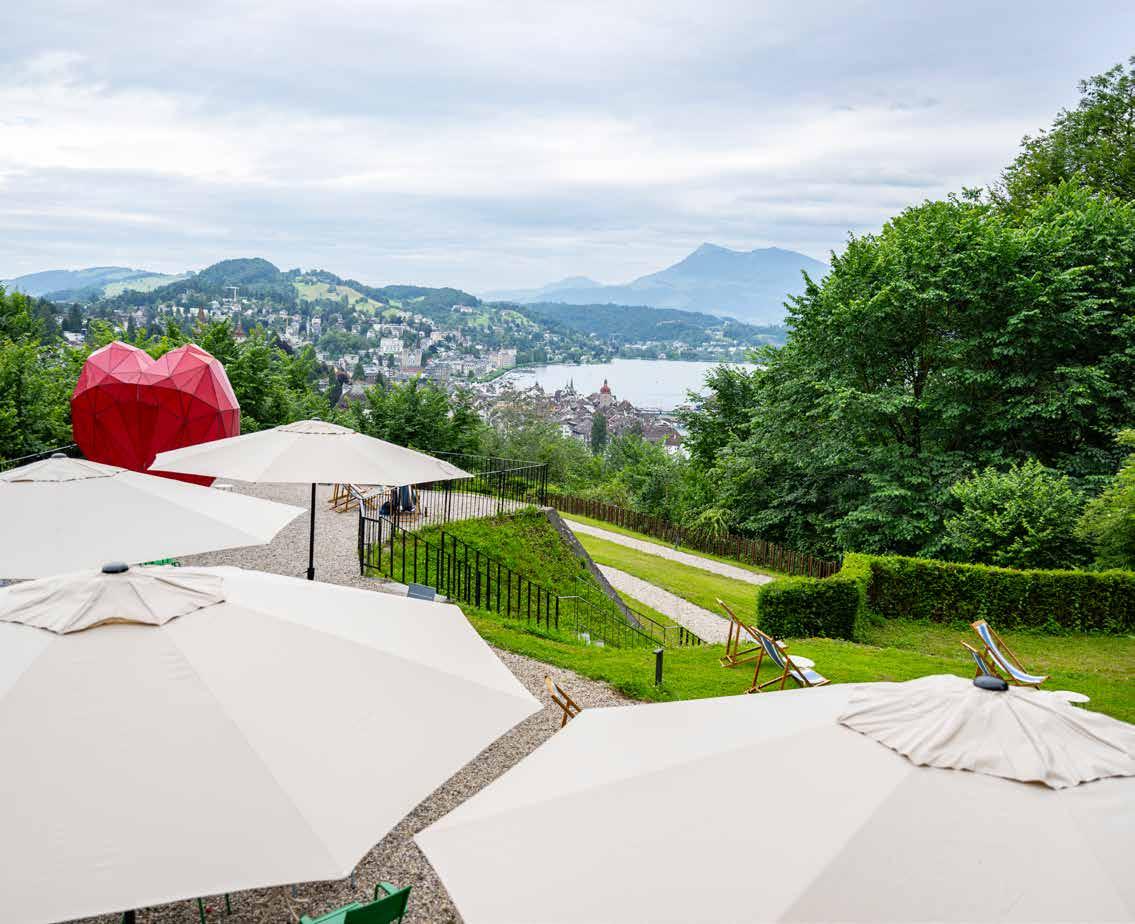 Ein Ort zum Durchatmen, Geniessen und Abschalten – mitten im Grünen und hoch über den Dächern der Stadt Luzern. Der Schlosspark des Château Gütsch lädt diesen Sommer zum Verweilen ein.