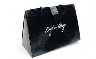 Canada’s most prestigious shopping centres, catering to discerning foodies, fashionistas and décoristas, allowing its well-heeled customers to check things off their “to do” lists in the glam-est way possible.” Boasting high-end stores such as Stuart Weitzman , Tommy Bahama, Swarovski, Le Creuset and fine-foods retailer Pusateri’s , it’s no wonder that something as simple as a mall gift card would pack considerable panache as well. At first glance, what presents itself as a small, triangular, black, crocodile-leather clutch purse with black strap handles, turns out to be a clever origami-like folded gloss card stock printed completely black, with the pattern of the animal’s skin embossed all over and with white logo script emblazoned across the front as if it were a designer’s autograph . As the lucky recipient lifts the Velcro tab holding together the top, the two sided part just as they would with a real purse to reveal a miniature white pillow box, decorated with sketches of products on which the recipient may want to splurge their gift, while containing the snugly-fitted gift card with precision die-cut tabs to hold securely in place.