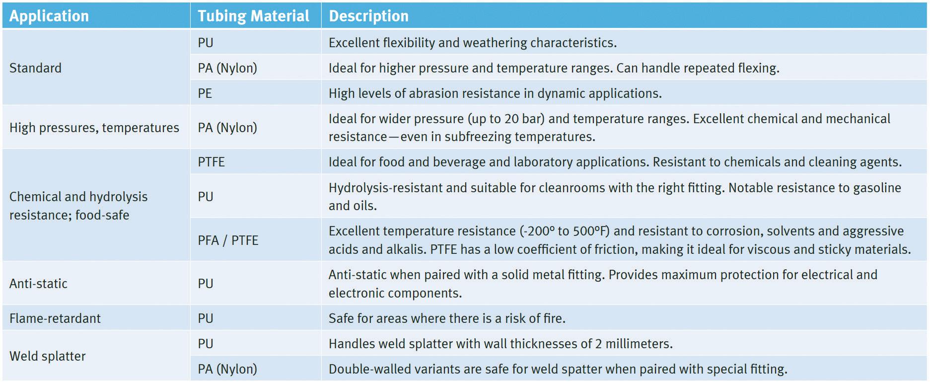 Each type of pneumatic tubing has its different strengths and weaknesses, all which must be balanced with the tube’s environmental and/or mechanical conditions. Keep in mind, however, that not all of these conditions will be obvious—making it extremely important to ask yourself the right questions during the initial design process of your machine. Considering all aspects of your tube’s operating environment will enable you to select the correct polymer and successfully avoid tubing damage, downtime and unnecessary costs. |DE
