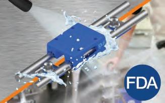 A160 polymer and high-alloy 316 stainless steel. The guide’s gap-free design features a self-draining carriage and rail, hygienic screws and large grooves to prevent water from accumulating. Its beveled edges allow cleaning solutions to run off easily. The bottom seal protects the space under the rail from dirt accumulation and its shafts are sealed to prevent any gaps from collecting debris.