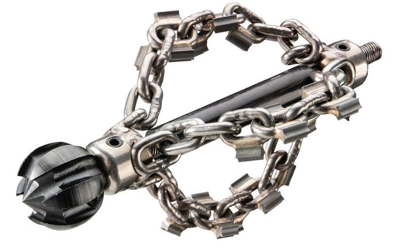 Flexi-Rooter uses ClogChopper six-bladed cutters along with carbide and non-carbide-tipped chain cutters to break through the toughest clogs, scale and roots. The cutters then grind up the stubborn stoppages and scour the pipe walls clean.