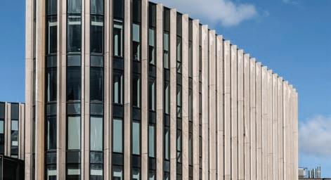 Details: The 15-storey research and innovation centre has monolithic panels that span floor to floor. A CNC machine was used to produce the custom forms to achieve the desired angles and slopes of