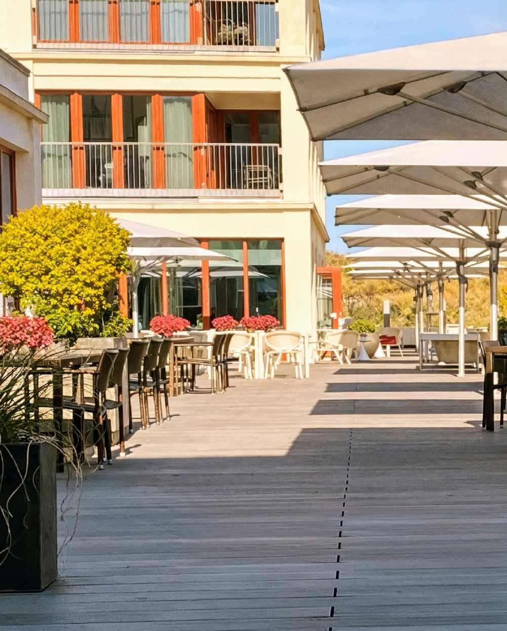 ... l'hôtellerie et la restauration Avec un parasol Glatz, vous transformez l’espace extérieur de votre restaurant en espace intérieur. En effet, la robustesse et la fonctionnalité de nos parasols vous offrent, à vous et à vos invités, protection et sécurité, même lorsque les conditions météorologiques sont instables. Vous pouvez ainsi commencer plus tôt la saison en plein air avec votre espace extérieur et accueillir vos clients jusqu’à la fin de l’automne. Presque tous les parasols peuvent être équipés sur demande d’un éclairage LED et de chauffages radiants, certains disposant même d’une motorisation. Grâce à la hauteur de fermeture élevée, il n’est pas nécessaire de déplacer le mobilier.