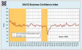 The slow but steady recovery in the BCI since June 2024 bears testimony to the difficulties that mark the business environment and economic performance. Despite the ups and downs, the BCI averaged 110.9 for the first nine months of 2024 compared to an average of 109.2 in 2023. Only three of the 14 sub-indices had a negative effect on the BCI. Business sentiment was positively swayed by more overseas tourist numbers, increased merchandise export volumes, an improving manufacturing output and lower inflation. Negative business sentiment concerned fewer new vehicles sold, struggling retail sales volumes and the decreased real value of building plans passed. Over the year to September 2024 SACCI’s BCI increased by two index points with tourist numbers, higher global precious metal prices, lower inflation, the stable supply of electricity and cheaper fuel at the pump as positive contributors. It is of grave concern to SACCI that 66 of the 257 municipalities are officially dysfunctional, rated by certain criteria. An agreed and entrusted approach at all levels of government should prevent the sign of hesitancy and uncertainty in business confidence. SACCI trusts that the Medium Term Budget Policy Statement (MTBPS 2024), as a joint effort by the newly formed government, will confirm the effort of resolving structural impediments in the economy and for business.