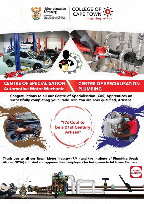 A Centres of Specialisation Programme has been introduced by the Department of Higher Education and Training to tackle priority skills. The College of Cape Town TVET concentrates on plumbing and automotive motor mechanics. A welding academy in Thornton has been opened with support from the merSETA (Manufacturing, Engineering and Related Services SETA).