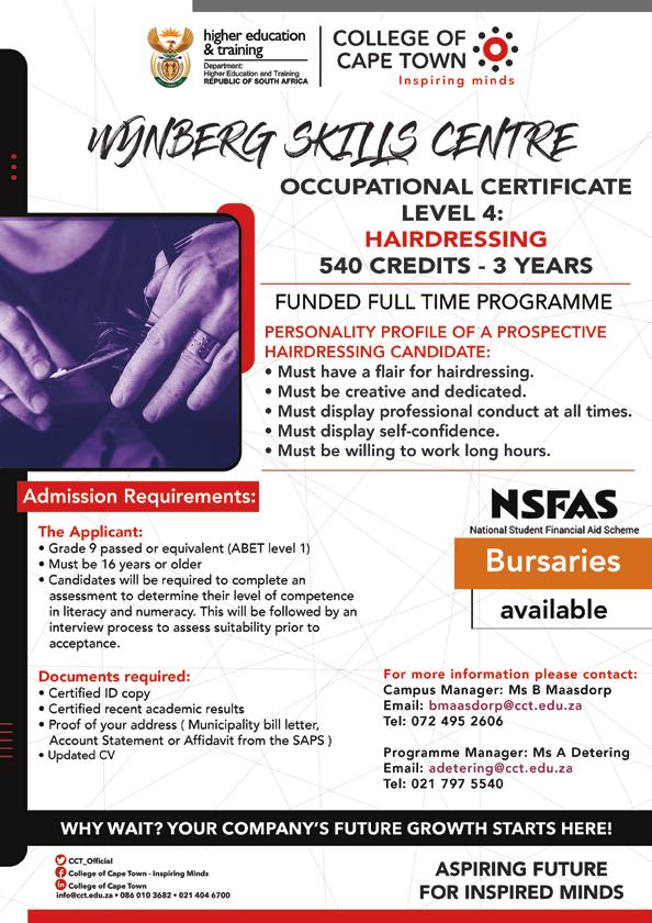 A Centres of Specialisation Programme has been introduced by the Department of Higher Education and Training to tackle priority skills. The College of Cape Town TVET concentrates on plumbing and automotive motor mechanics. A welding academy in Thornton has been opened with support from the merSETA (Manufacturing, Engineering and Related Services SETA).