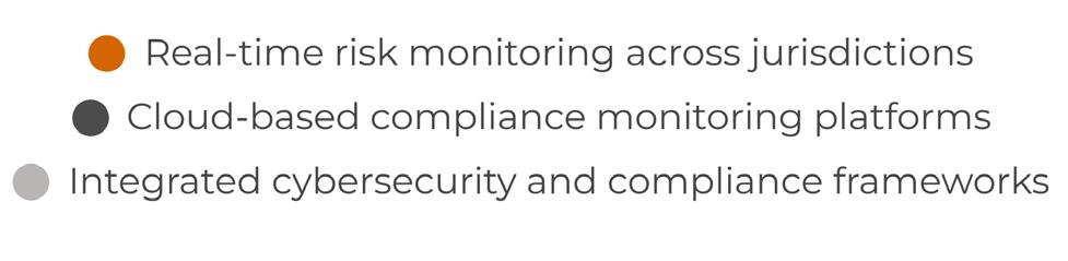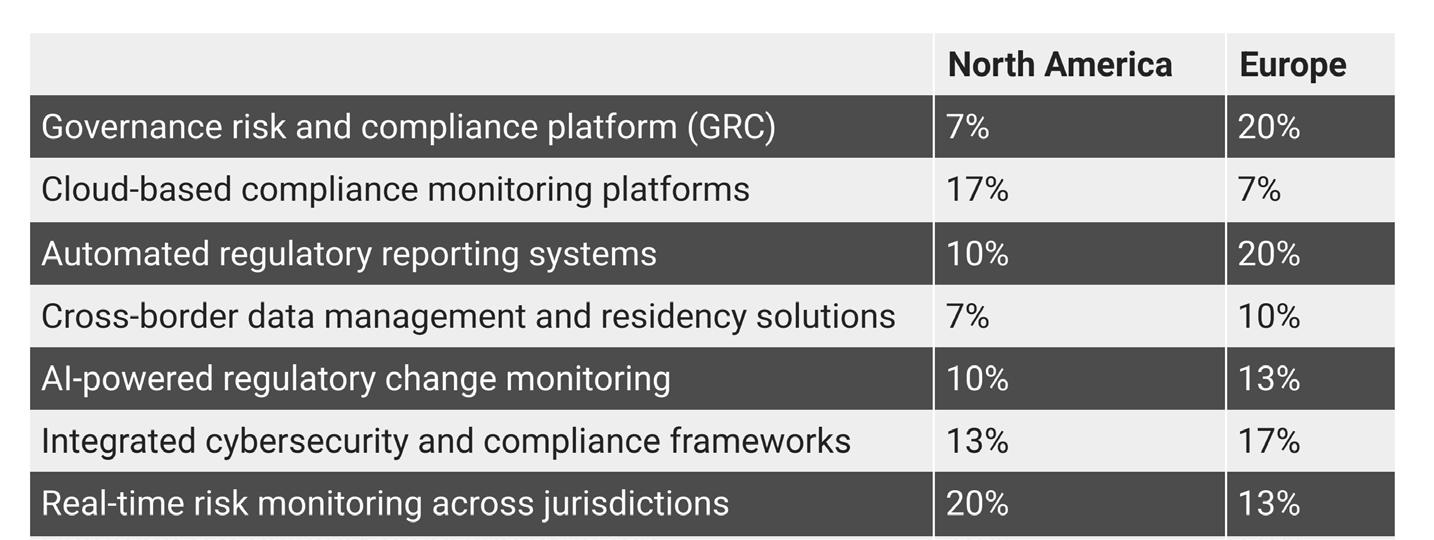 The technology solutions that firms have either implemented or are considering for cross-border compliance diverged geographically. European firms were more likely to opt for governance risk and compliance platform (GRC) and automated regulatory reporting systems while North American ones are most likely to favour real-time risk monitoring across jurisdictions and then cloud-based compliance monitoring platforms.