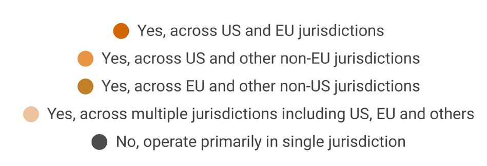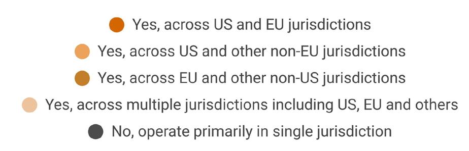 All the surveyed large firms operate across multiple regulatory jurisdictions had been in business for more than five years, providing time to grow. The vast majority (75%) were global, present in not only the US and EU but also other jurisdictions. The remaining 25% were all present in the US and EU.