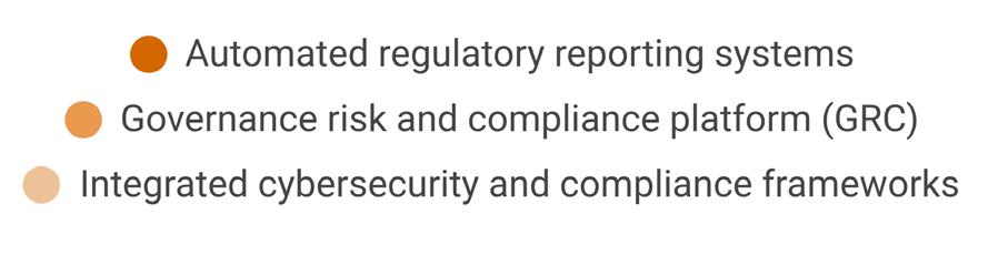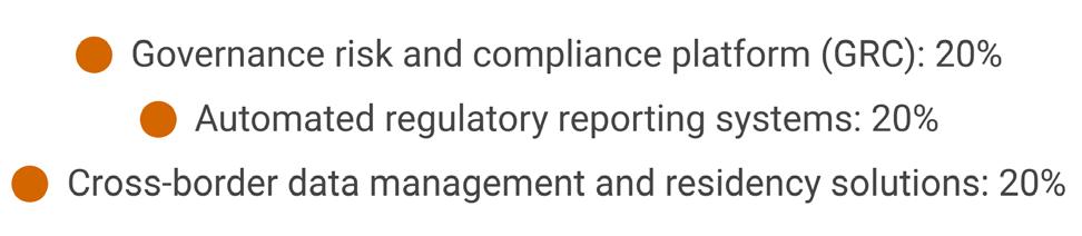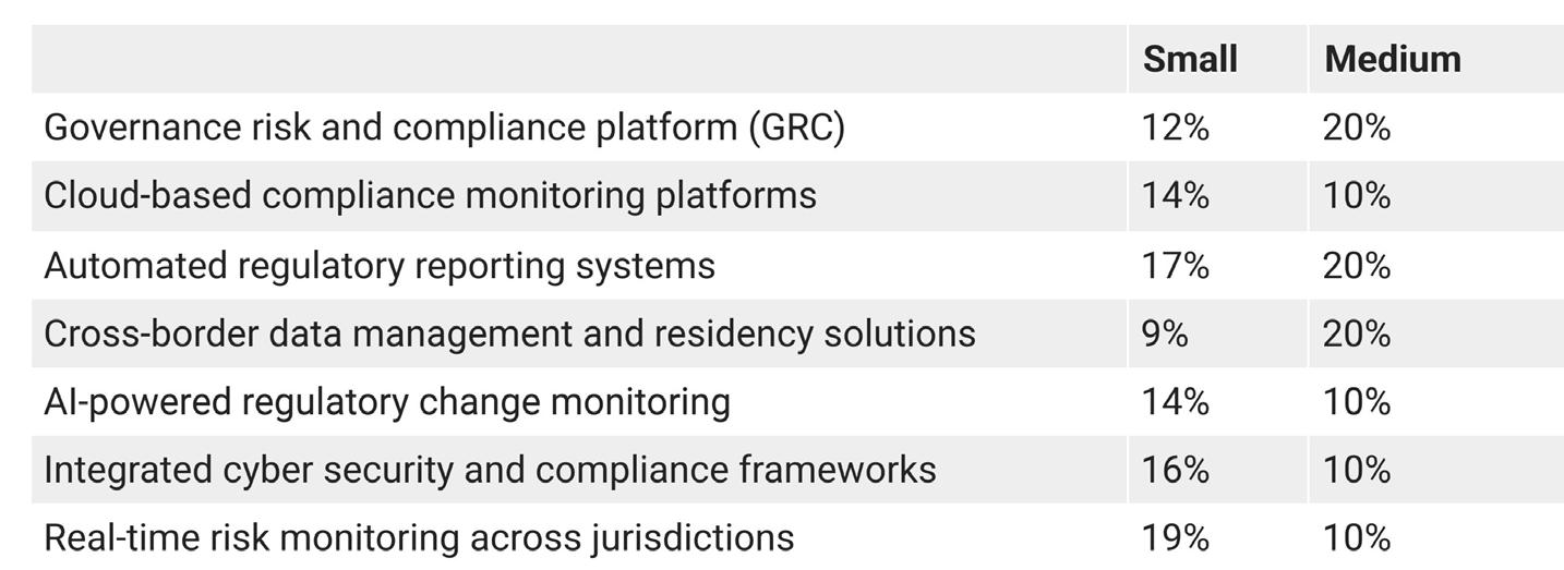 Mid-sized firms are also enthusiastically adopting technological solutions. The three most widely adopted solutions are: governance risk and compliance platform (GRC); automated regulatory reporting systems; and cross-border data management and residency solutions.