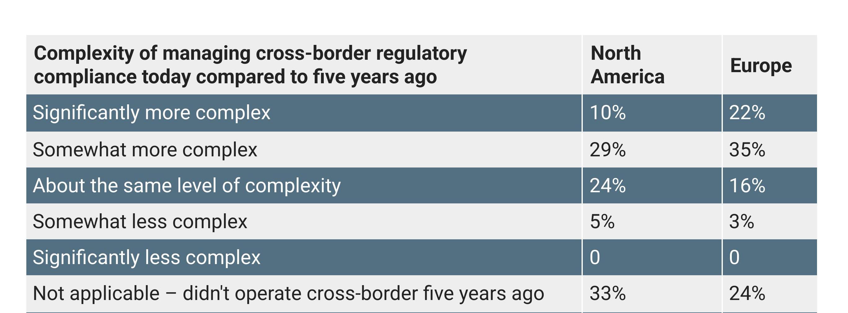 Mid-sized firms were most likely to find managing cross-border compliance more onerous than five years ago; 80% of mid-sized firms report either significantly or somewhat more complexity.