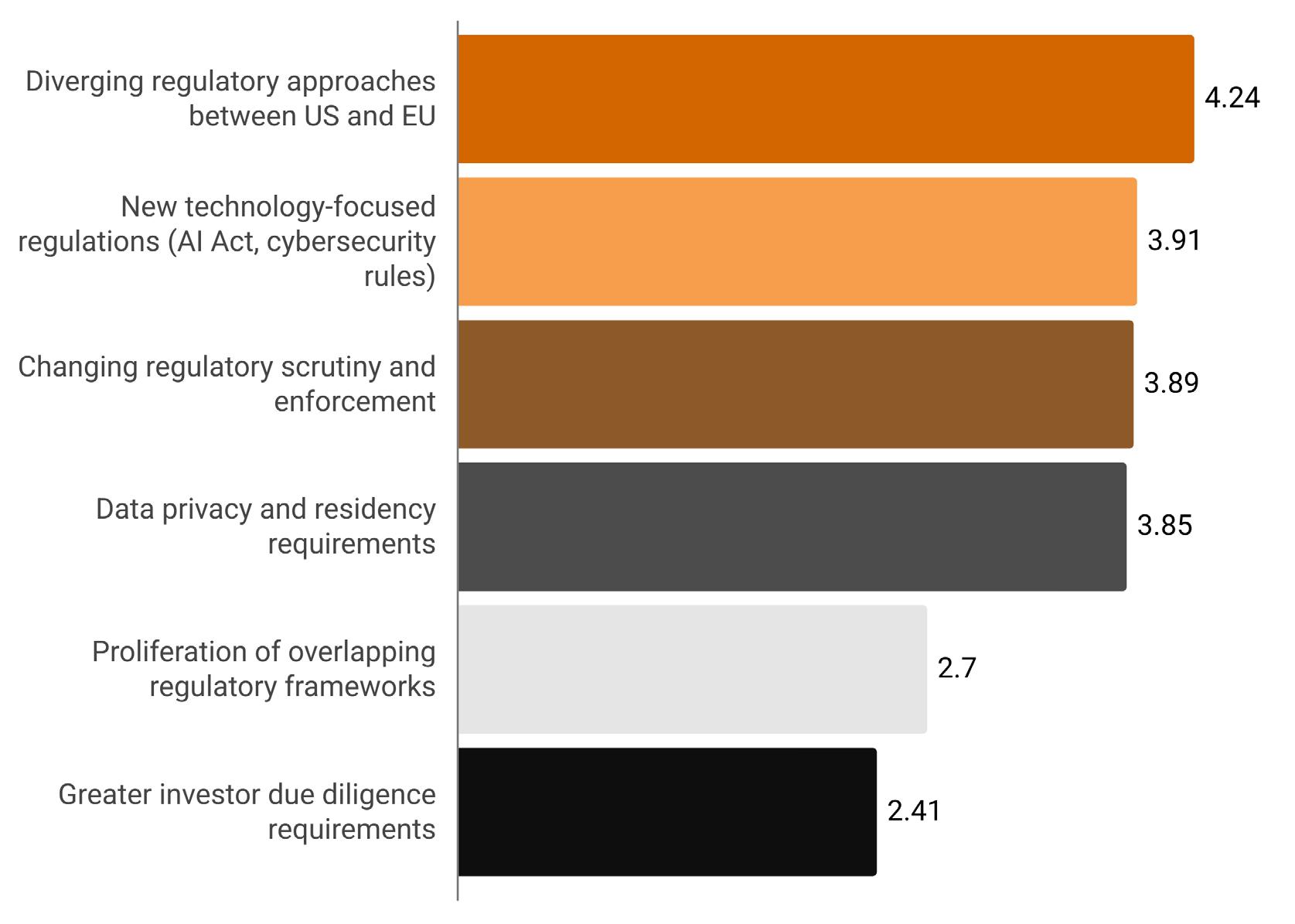 There are material differences in the biggest issues: North American firms were relatively more concerned about technology-focused regulations while Europe was relatively more concerned about the proliferation of overlapping regulatory frameworks.