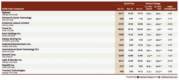online gaming is only legal in six U.S. jurisdictions, but in 2021 it produced more than $3.8 billion in gross gaming revenues. So Eilers & Krejcik launched its Online Game Performance Report, in which it evaluates 29 online gaming sites with a total of 1,780 unique game themes, with 36,565 games tracked each month in five of those states—New Jersey, Pennsylvania, West Virginia, Connecticut and Michigan—representing almost 60 percent of the active market. The chart at right gives a breakdown of the games that are offered by 22 companies across those online casinos. Evolution, which specializes in “live” gaming, has the lead by far, accounting for 27 percent of the total GGR in October 2022. Most of the other major game suppliers come next, and then some online-games-only companies making some progress. To obtain a copy of any Eilers & Krejcik reports, contact Rick Eckert at reckert@ekgamingllc.com.