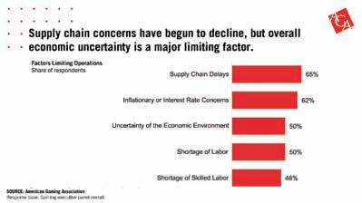 4. Whether an operator or supplier, executives face a range of business challenges. Supply chain issues remain the top concern even as the number of executives citing supply chain as a “factor limiting business” fell to 65 percent from a high of 75 percent in Q1 2022. Inflation and interest rate concerns (flat from Q1 20222) as well as concerns around the uncertainty of the economy (up from 46 percent in Q1 2022) also remain major limiting factors for the industry.