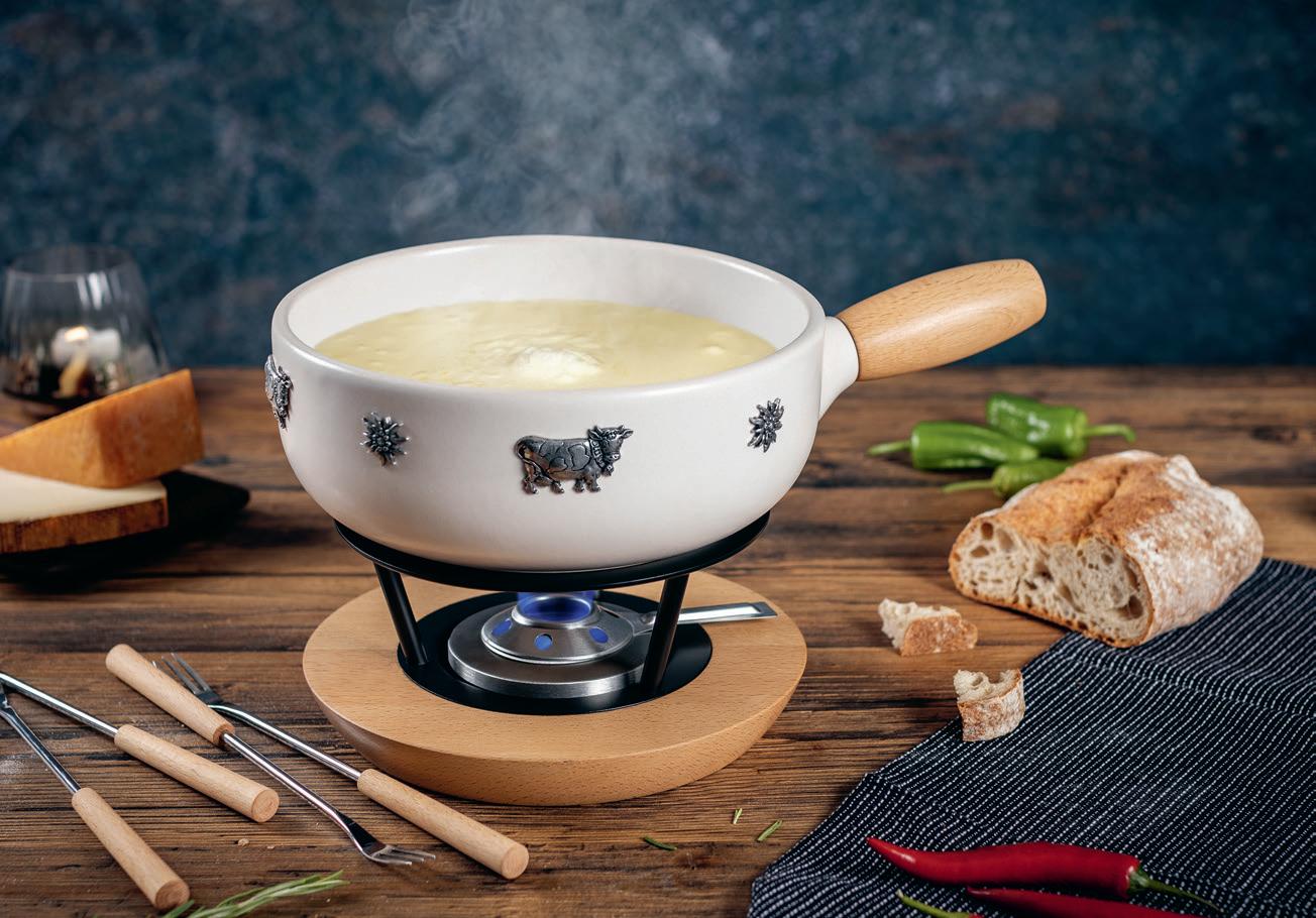 von Hand in Italien gefertigt, in Rikon im Tösstal mit einem edlen, in der Schweiz hergestellten Buchen holzgriff versehen und mit silbernen Edelweiss- und Kuhsujets verziert, ist das «Alpenflair» eine Hommage an die Schweizer Bergwelt. Das Caquelon ist für alle Herdarten geeignet – auch für Induktionsherde – und in einer Limited Edition erhältlich. Passend dazu sind ein Rechaud und ein FonduegabelSet mit Elementen aus Buchenholz erhältlich.