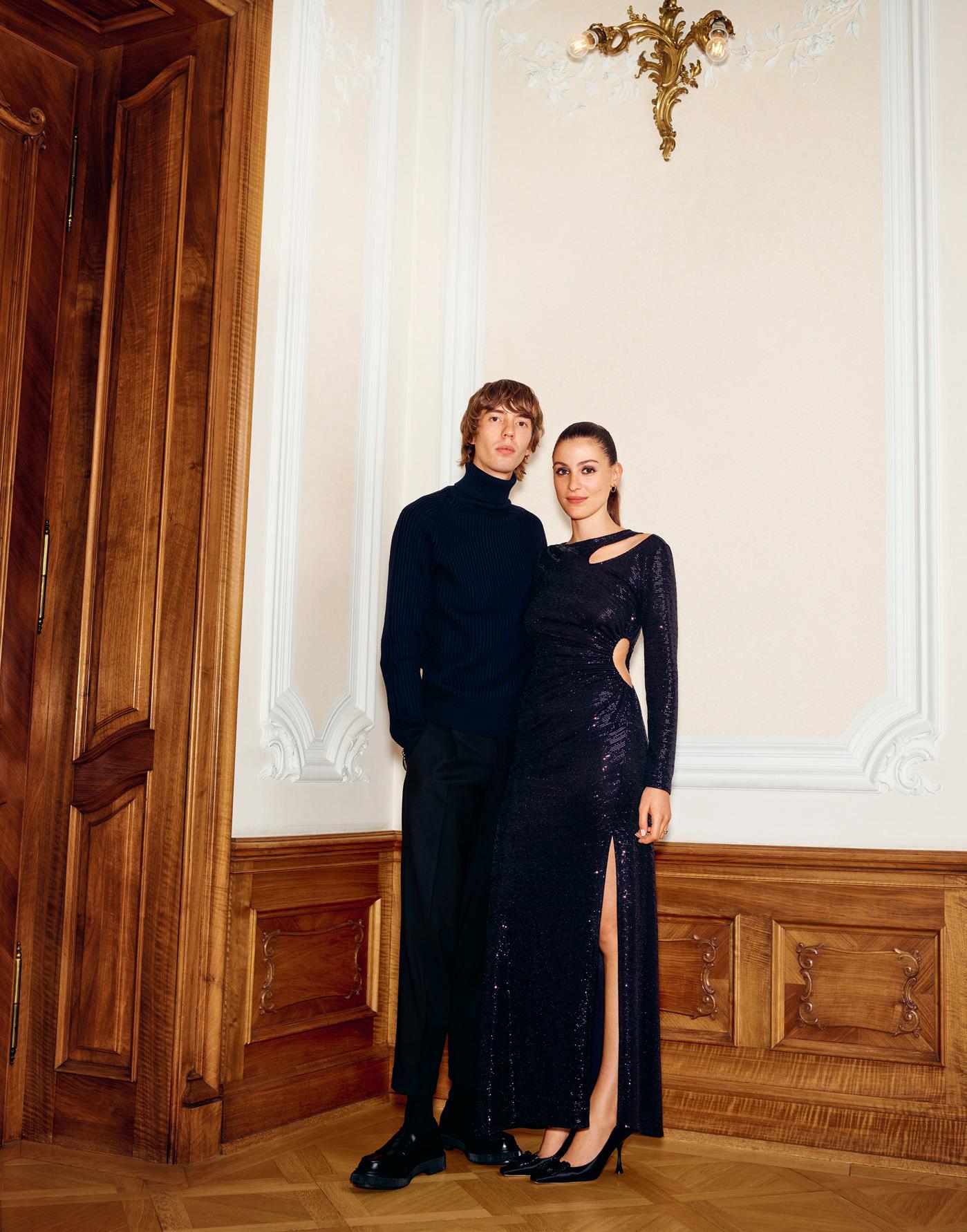 Wim: ZANONE Pullover 320.– PT TORINO Hose 360.– ADIEU Loafer 450.–Manon: MAJE Kleid 539.– SERGIO ROSSI Pumps 930.–