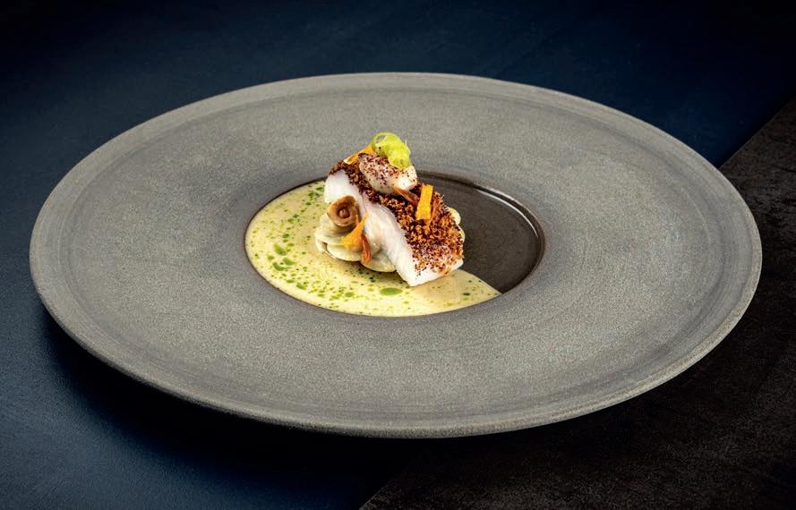 Steinbuttfilet auf einen mit Olivenöl beträufelten Teller legen und mit Fleur de Sel und schwarzem Malabar-Pfeffer würzen. Thymian- und Rosmarinzweig auf das Steinbuttfilet legen und mit Frischhaltefolie abdecken. 25 Minuten bei 52 °C dämpfen. Folie abziehen. In vier gleich grosse Stücke schneiden.
