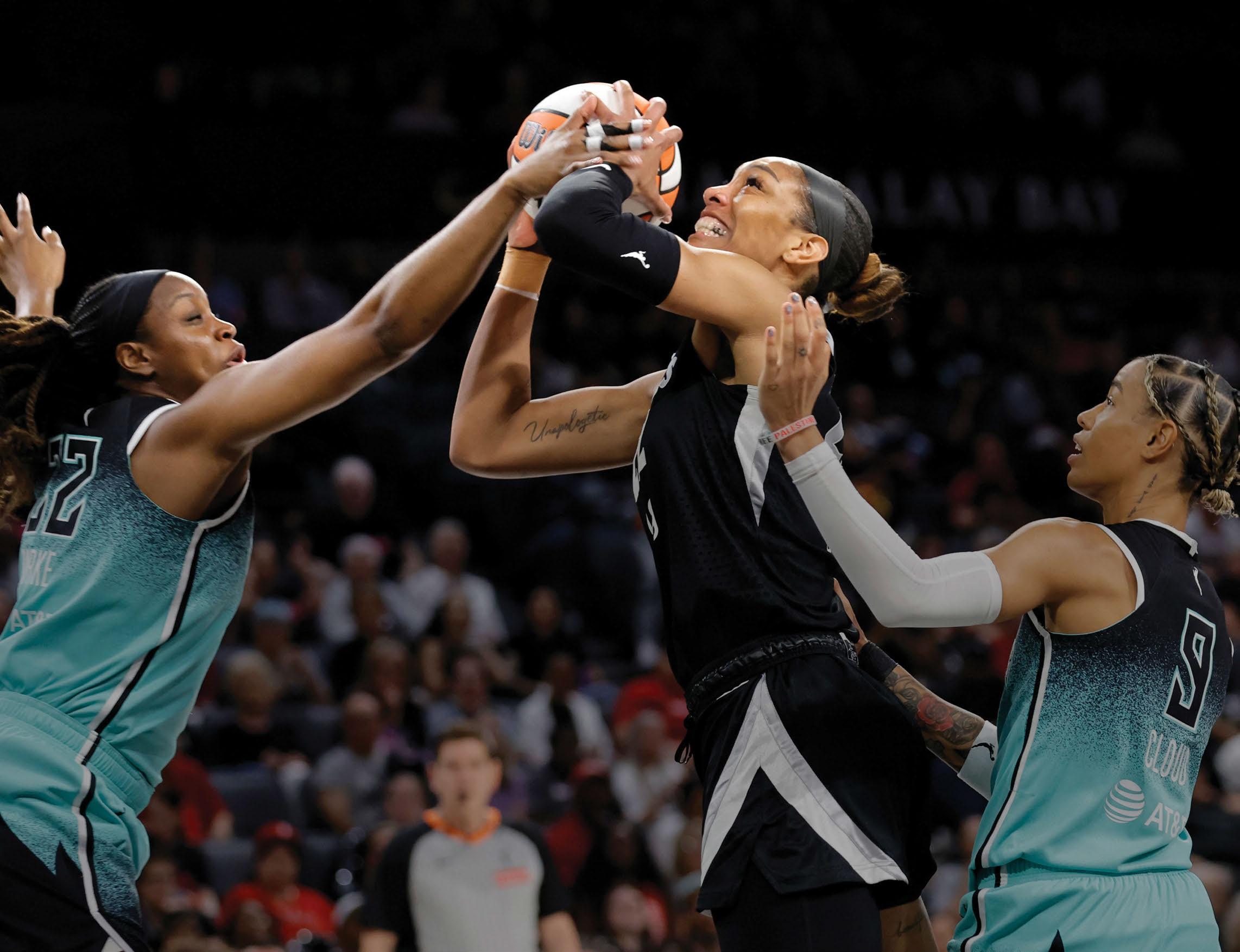 Las Vegas Aces center A’ja Wilson is fouled going to the basket against the New York Liberty at Michelob Ultra Arena on August 13. The Aces won, 83-77.