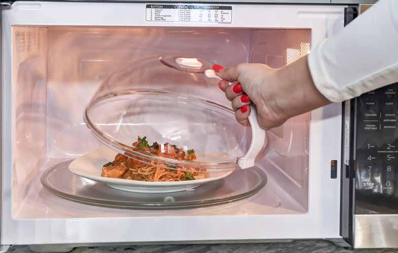 Cubre platos de microondas con agarradera. This transparent microwave cover with easy-grip handle includes a small vent on top to let steam escape! BPA free. Dishwasher safe. Approx. 4-1/4" H x 10-1/4" D.