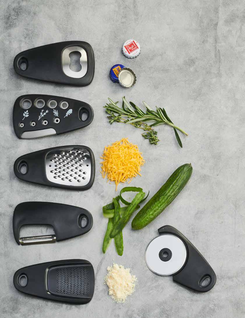 Dispositivos multiusos - conjunto de 7. Outfit your kitchen with this must-have trendy gadget kit! Set includes 1 grater, 1 grinder, 1 pizza cutter, 1 bottle opener, 1 swivel peeler, 1 herb stripper and cleaning brush. Stacks for easy storage. Dishwasher safe. Approx. 5-1/4” H x 3” W.
