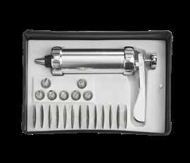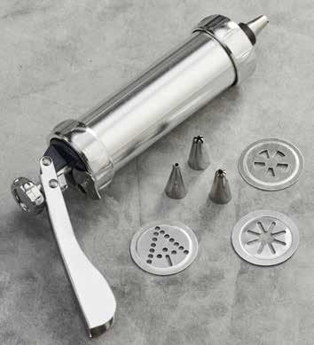 Prensa de galletas - Juego de 21 piezas. This set contains 13 discs to make spritz cookies and 7 tips for frosting! Comes in a convenient storage case! Hand wash only. Aluminum. Case 8-1/2" H x 12" W.