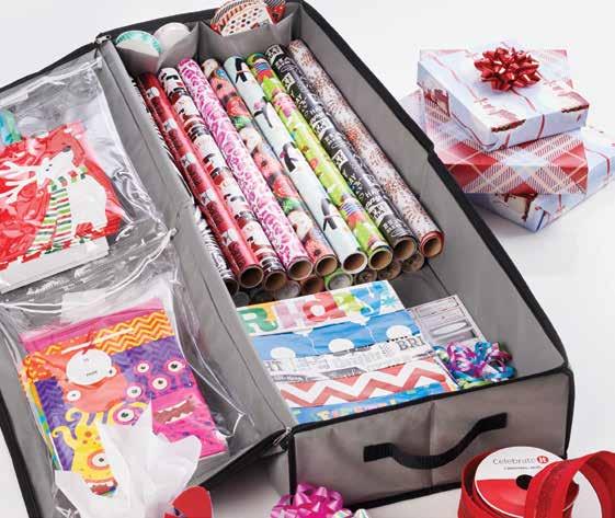 Organizador de papeles de regalo. Keep all your wrapping needs wrinkle free and easy to access with compartments for your wrapping paper, ribbon, tissue paper, scissors and so much more. Approx. 6-1/4" H x 38" W x 11" D.