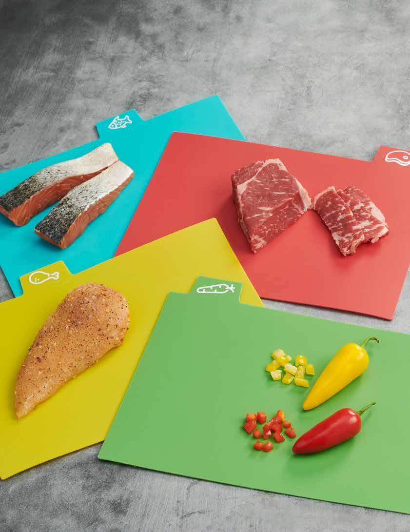 Tablas para cortar - Juego de 4. Our chopping board set is designed with 4 food icons to keep handling food safe. The cutting boards are made of food grade plastic and are BPA free. Comes with convenient storage stand. Dishwasher safe. Each board approx. 8-1/4" H x 12" W.