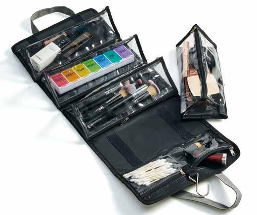 Estuche de viaje para artículos de tocador con 4 bolsas desmontables. This versatile travel organizer has 4 detachable zipper pouches. These clear pouches make it easy to keep everything organized and the case conveniently rolls up to take with you anywhere! Includes a metal hanger so you can hang in your closet as well! Approx. 6-3/4” H x 10-1/2" W x 6” D when rolled, approx. 26-1/2" H x 10-1/2" W when fully extended.