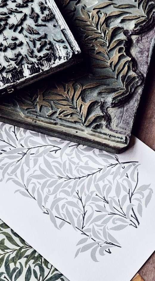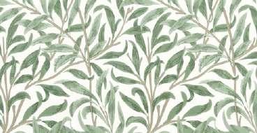 1887 Designed by William Morris モリスが娘のメイと、ケルムスコット・マナー の近くのテムズ川へと繋がる小さな川の岸 辺を歩いていた、ある日の午後の情景をもと に描かれたデザイン。 メイはその後、ウィロー バウは「私たちの思 い出の柳が精巧に描かれており、ロンドンの 人々のリビングを彩る壁紙として広く使われ るようになった」と記録しています。