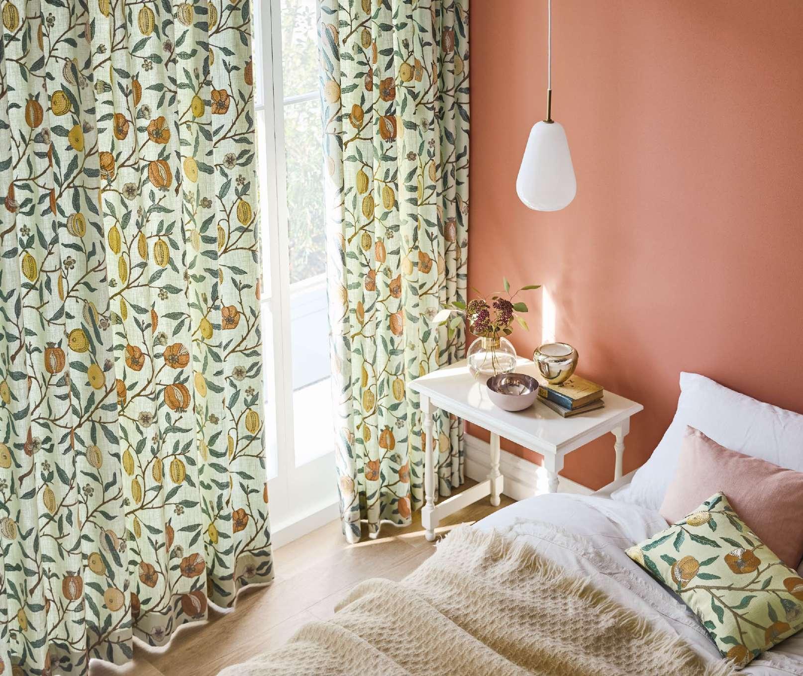 フルーツのモチーフがふんだんに刺繍されたカーテンを主役に、植物柄やグリーンの キーカラーをさりげなくちりばめた、リラックス感あふれるコーディネート。