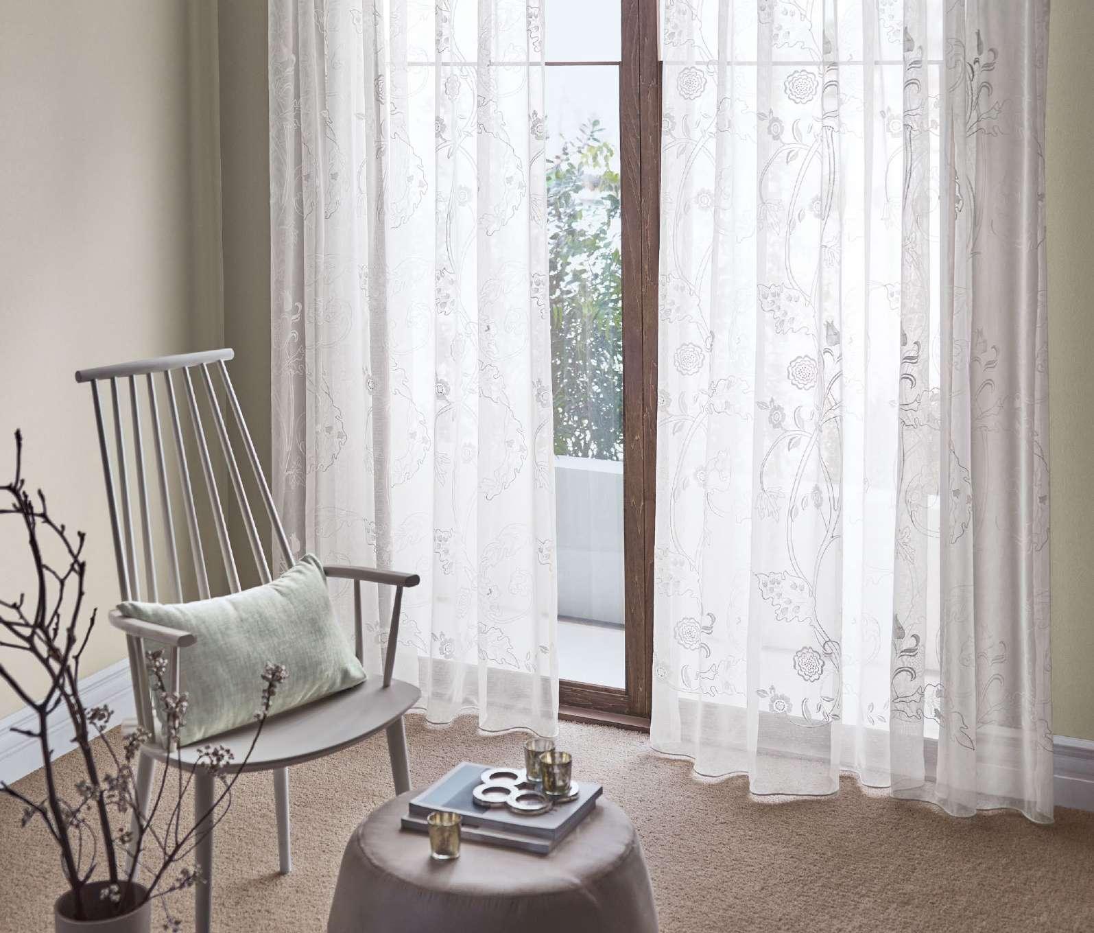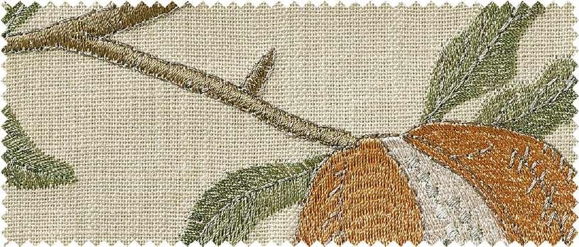 Exquisite embroidered fruit motifs are subtly interspersed with inspirational shades of green botanical foliage to create this serene window decoration.