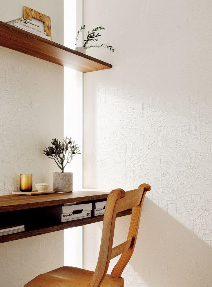 間接照明の場合など使用環境によっては下地の凹凸が目立ちやすい商品 です。特に入念な下地処理を行い、糊ダマリに注意して施工してください。糊 付け後は大きくたたみ、折りジワに注意して、上積みは避けてください。また 見る角度や環境によってジョイント部分が目立つ場合があります。