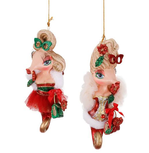 + XMAS LADY W/SHOPPING BAGS ORN ASS/2 RD/GR 11,5CM