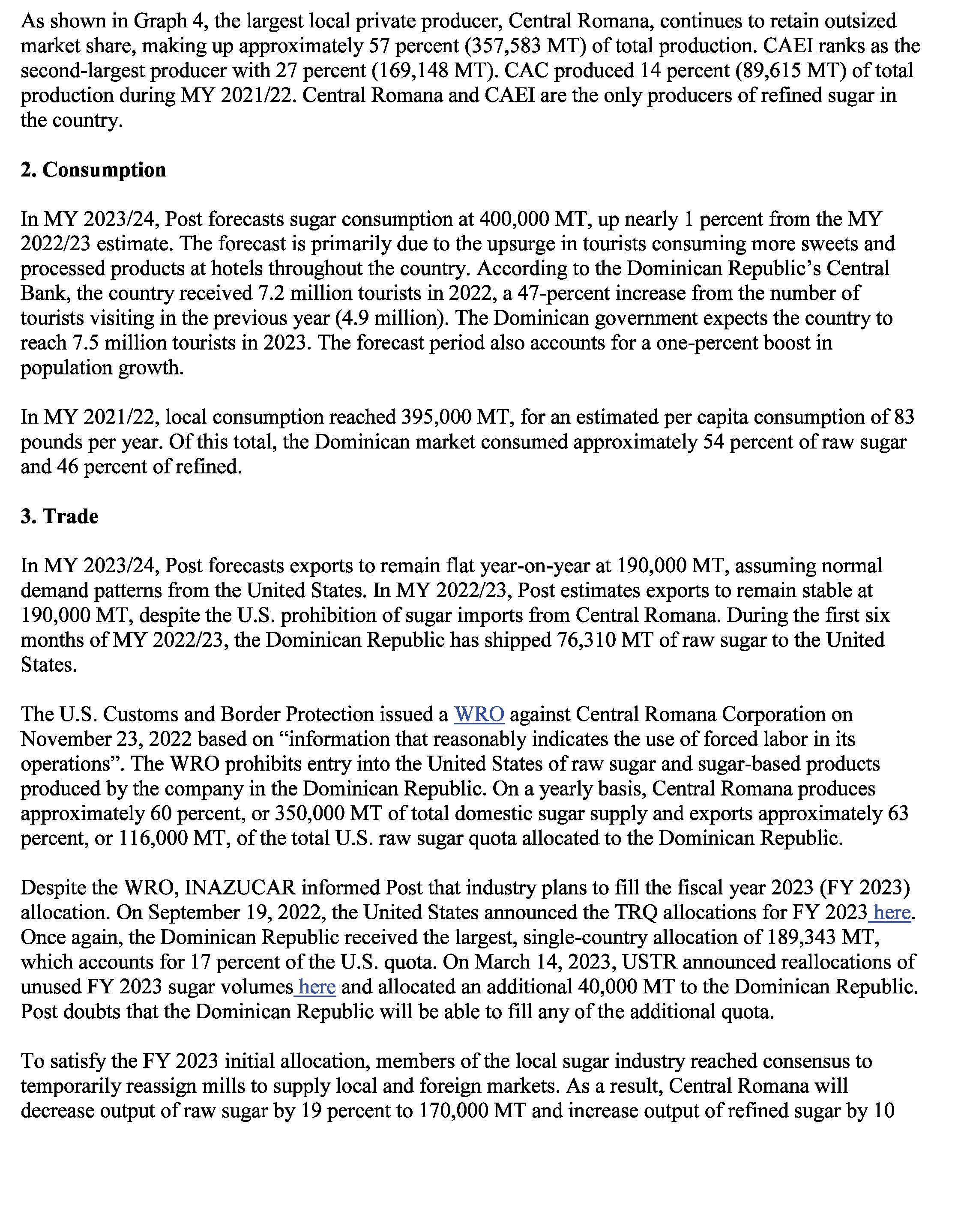 As a severe drought looms large over the sugar mill areas in the Dominican Republic (DR) and the U.S. Customs and Border Protection (CBP) continues to prohibit sugar and sugar-based imports from the top Dominican producer, Post forecasts local production at 530,000 metric tons (MT) for marketing year (MY) 2023/24 (October/September), 12 percent down from the MY 2022/23 estimates. Despite lower sugar production projections, Dominican authorities have pledged to meet both local demand and its allocated U.S. sugar quota. Post believes that the DR will not be able to supply any of the additional allocation recently announced by the U.S. Office of the Trade Representative (USTR).