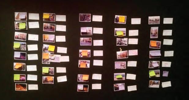 with discussions about daily commuted routes. Each participant placed their route on a map of Beirut; whether they bike, walk, drive or take public transportation. Later, participants chose 3 pictures that represent their idea of a street: what they like, what they fear, what they avoid, what they dream of. Any kind of emotion evoked by their experience is expressed, accepted and shared. Introduced to A Pattern Language, participants divided themselves to teams under common themes such as: Heritage in streets, traffic, walkability, cultural life. Each member generated a pattern within the team and connected it to larger or smaller patterns.
