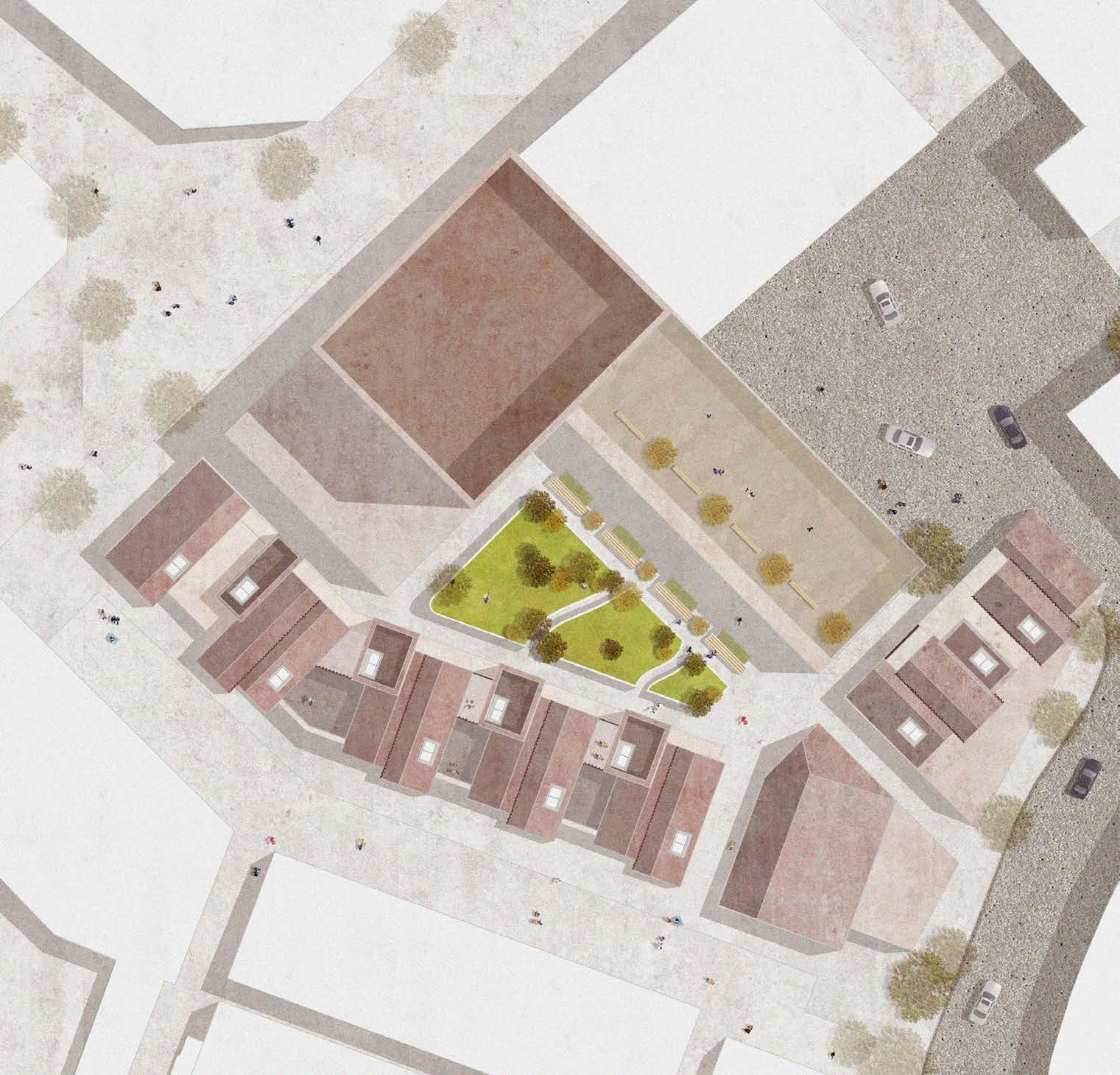The townhouse zone with commercial ground floor is located close to the market and Peel St, which leads to more commercial profits. The apartment zone with a private workshop area is north of the central square.