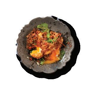 Fried cage-free egg, holy basil, garlic, chilli ผัดเขือส่ายหน้า