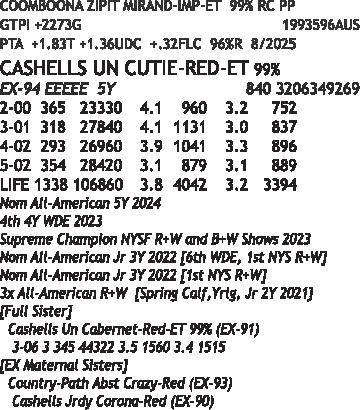 6th Dam: Joleanna Perseverance Raincent EX-90 6-00 345 28800 3.6 1029 3.2 931 7-01 2 365 28940 3.8 1089 3.2 958 Life 166460 3.9 6414