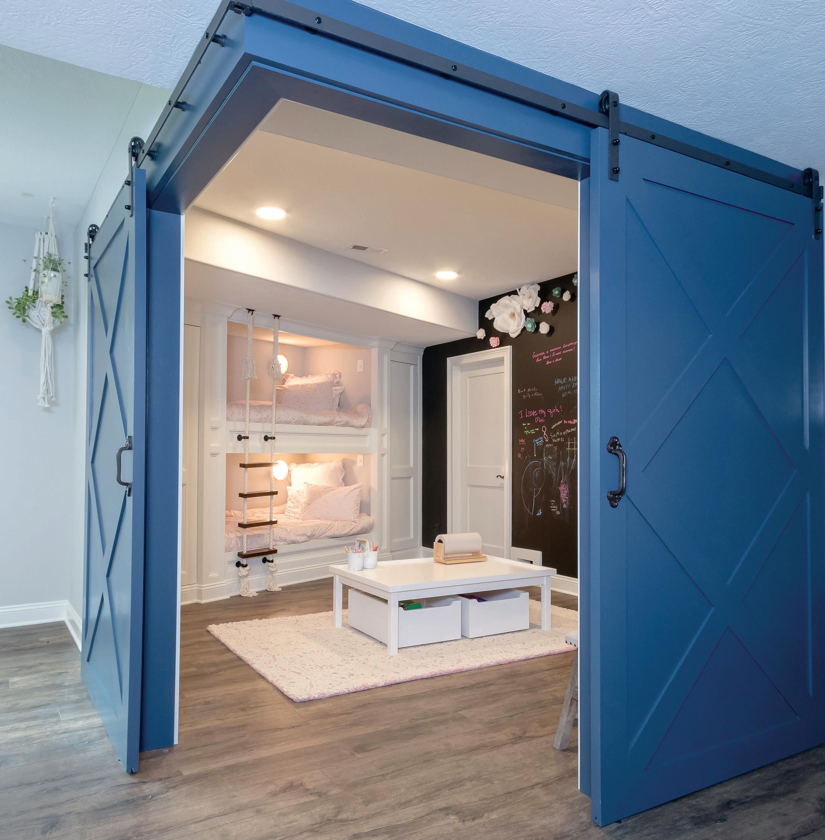 The entire area can be enclosed with two sliding barn doors painted the same blue as the feature wall.