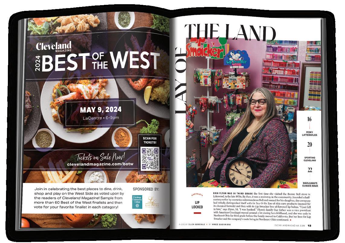 “Cleveland” (ISSN 0160-8533) is published monthly for a total of 12 issues per year by Great Lakes Publishing Co., 1422 Euclid Ave., Suite 754, Cleveland, OH 44115. / Periodical postage paid at Cleveland, Ohio. Postmaster: send address changes to Cleveland, 1422 Euclid Ave., Suite 730, Cleveland, OH 44115. / Subscription rates: U.S. $20.00 one year, $30.00 two years, $38.00 three years / All subscriptions are subject to state of Ohio sales tax of 8% based on publisher county of origin. / Copyright 2024 by Great Lakes Publishing Co. All rights reserved. / Reproduction or use, without written permission, of editorial or pictorial content in any manner is prohibited. Title registered in U.S. Patent Office. / Printed in the United States. / Unsolicited manuscripts cannot be returned unless accompanied by a properly addressed envelope bearing sufficient postage. The magazine accepts no responsibility for unsolicited manuscripts, artwork or cartoons. Contents April 2024 volume 53 / issue 4 107 52 24 68 36 19