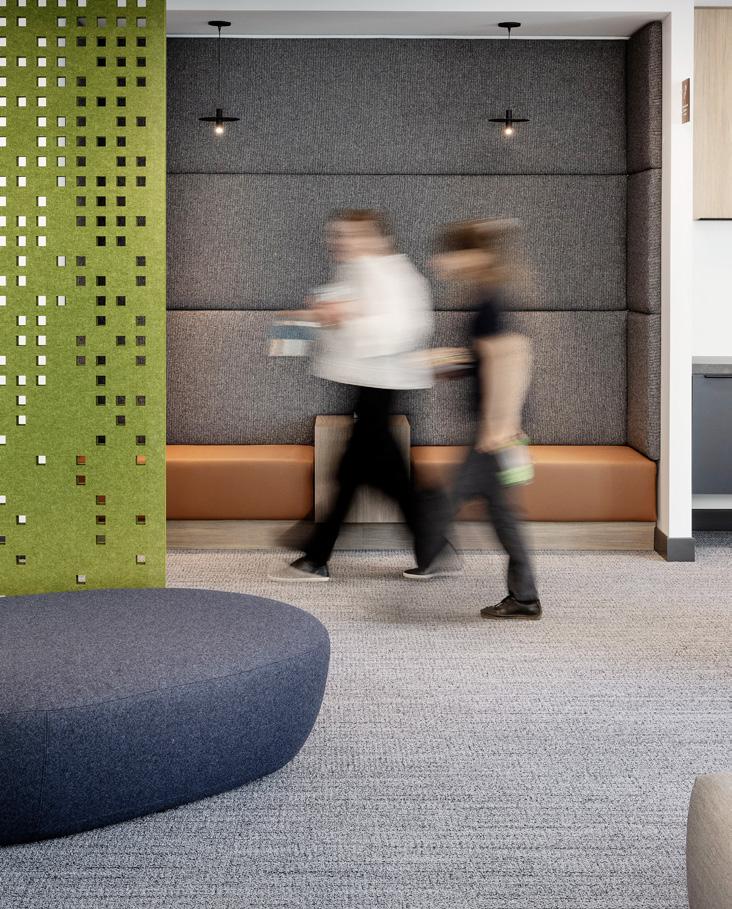 That means focusing on the details, such as patterns in carpeting and woodwork, ceiling acoustics and lighting. Organic, rounded light fixtures that play on natural forms and rhythms were chosen to provide visual interest, while wood materials were chosen to connect employees and visitors to nature, which has been proven to enhance health and well-being.