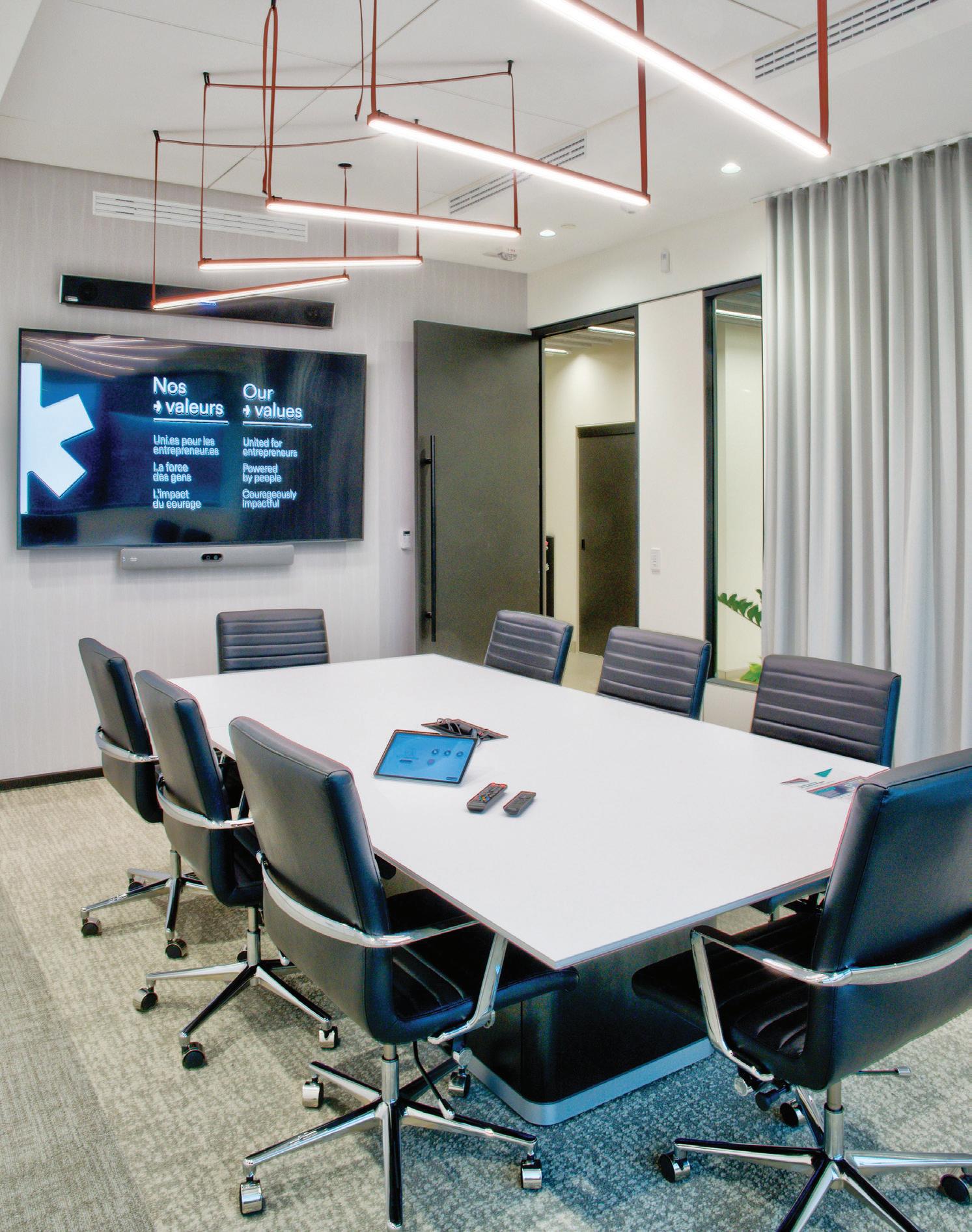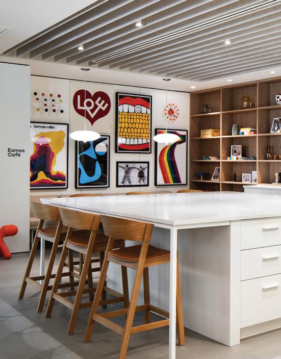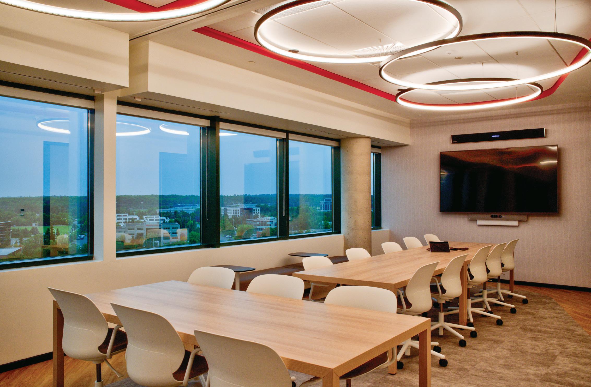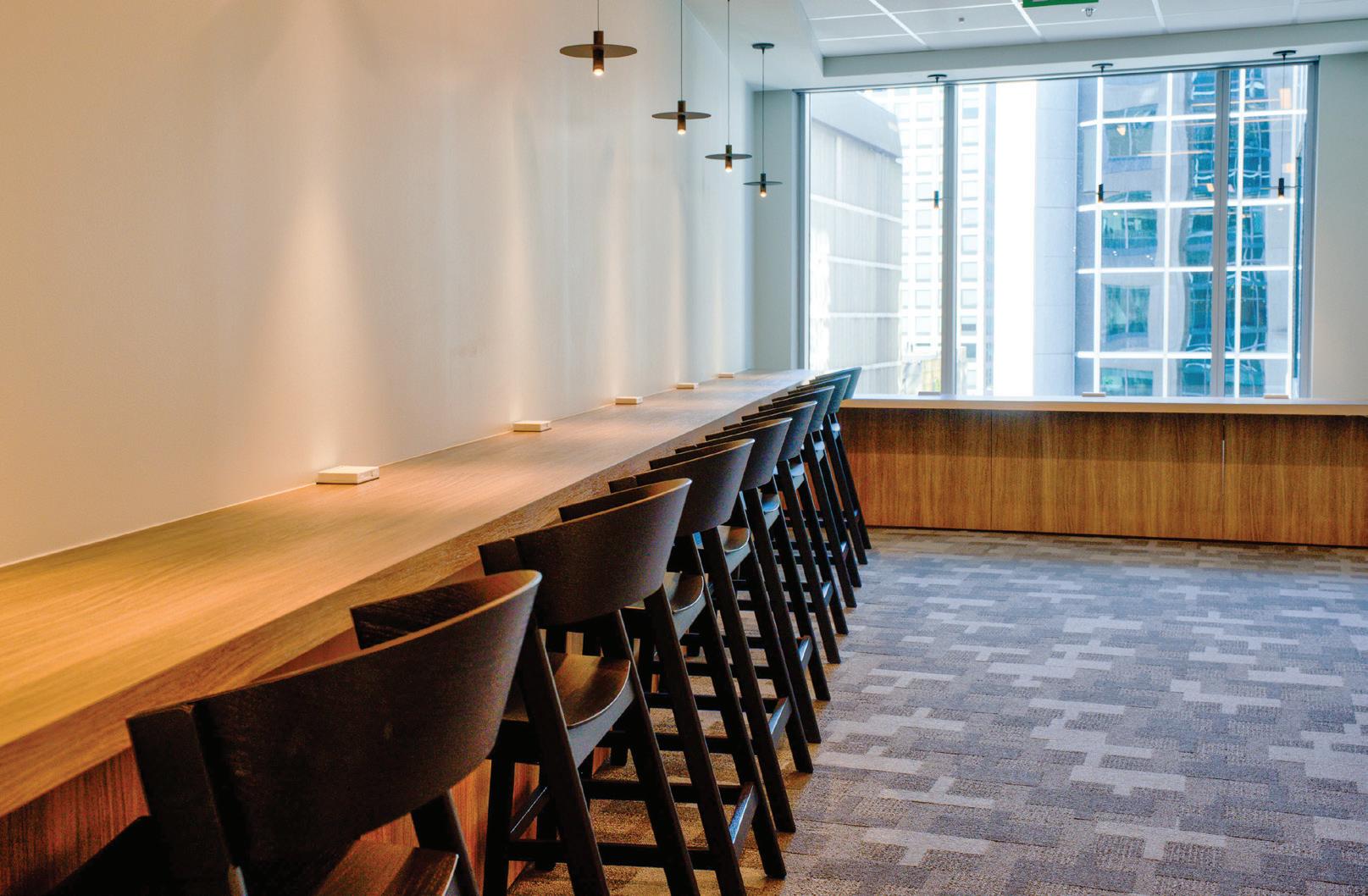 There are plenty of amenities for the day, such as a coffee bar, varied meeting and huddle rooms, mobile whiteboards, sit-to-stand desks and state-of-theart technology for easy connectivity. For every eight people, there is a privacy pod available, ensuring there is always sufficient space for those who need a quiet moment. Meeting room technology platforms deliver equitable experiences for all participants. “With our technology choices combined with our ‘infield and outfield’ seating levels, people who are remote feel that they are part of the meeting, and that inclusivity drives great collaborative exchanges,”