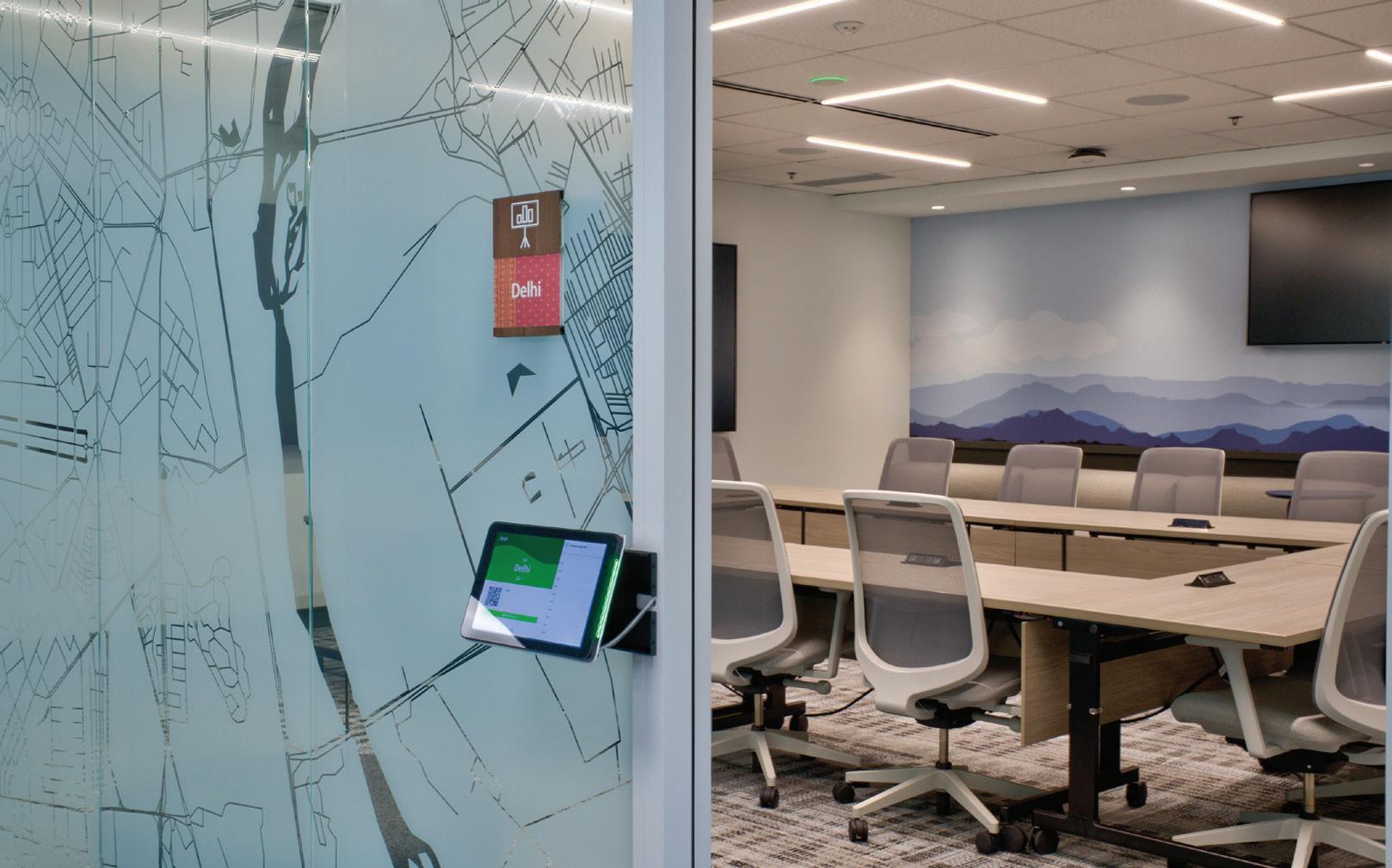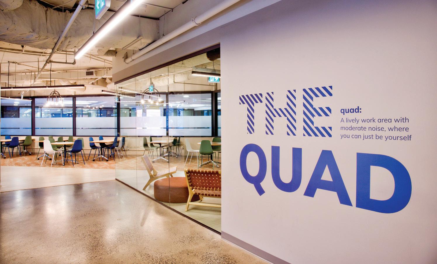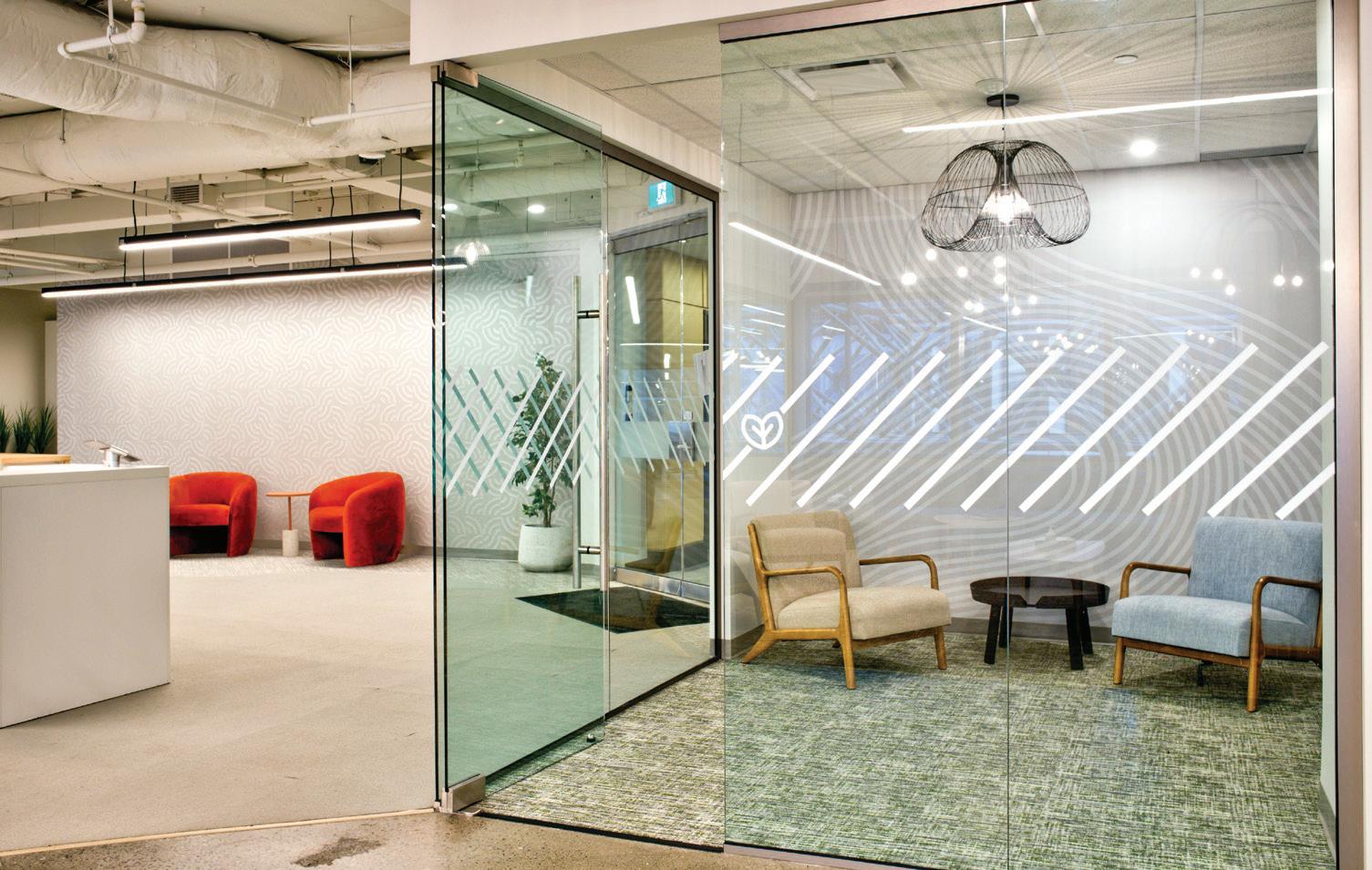 There are plenty of amenities for the day, such as a coffee bar, varied meeting and huddle rooms, mobile whiteboards, sit-to-stand desks and state-of-theart technology for easy connectivity. For every eight people, there is a privacy pod available, ensuring there is always sufficient space for those who need a quiet moment. Meeting room technology platforms deliver equitable experiences for all participants. “With our technology choices combined with our ‘infield and outfield’ seating levels, people who are remote feel that they are part of the meeting, and that inclusivity drives great collaborative exchanges,”