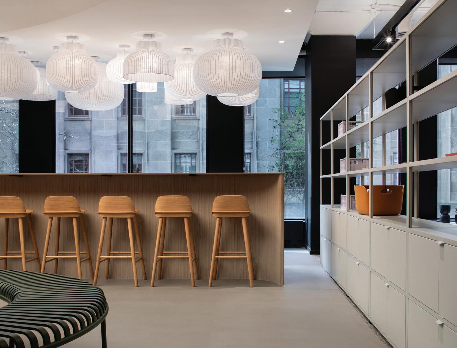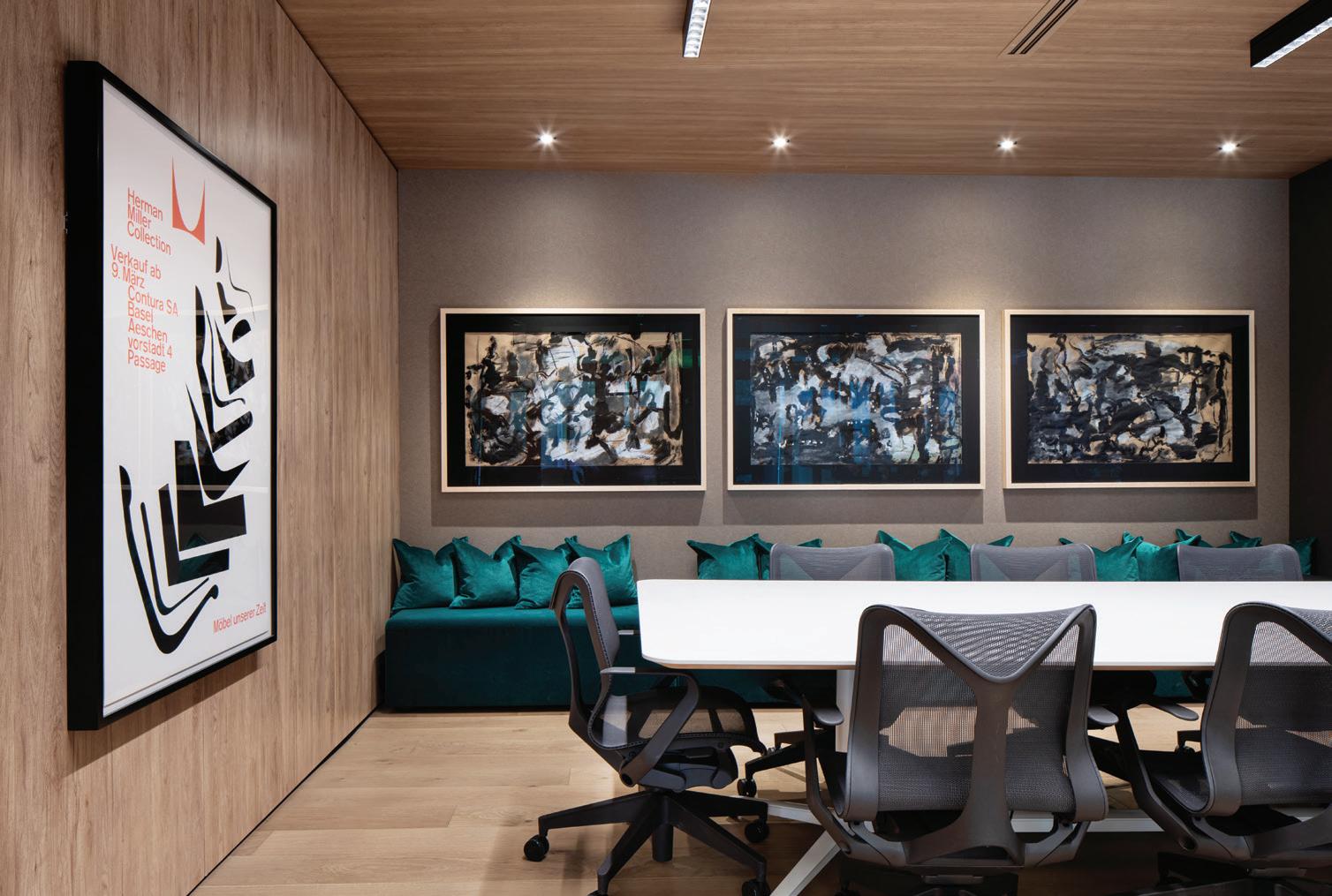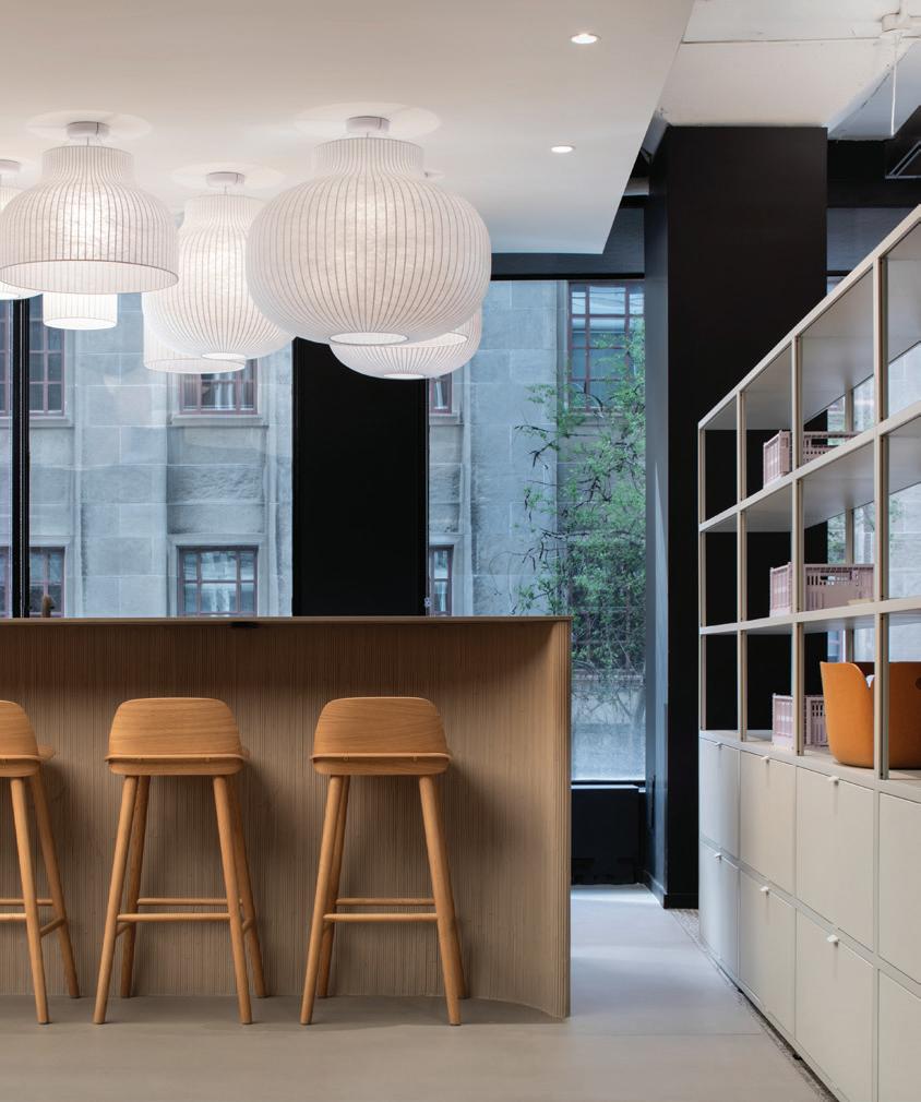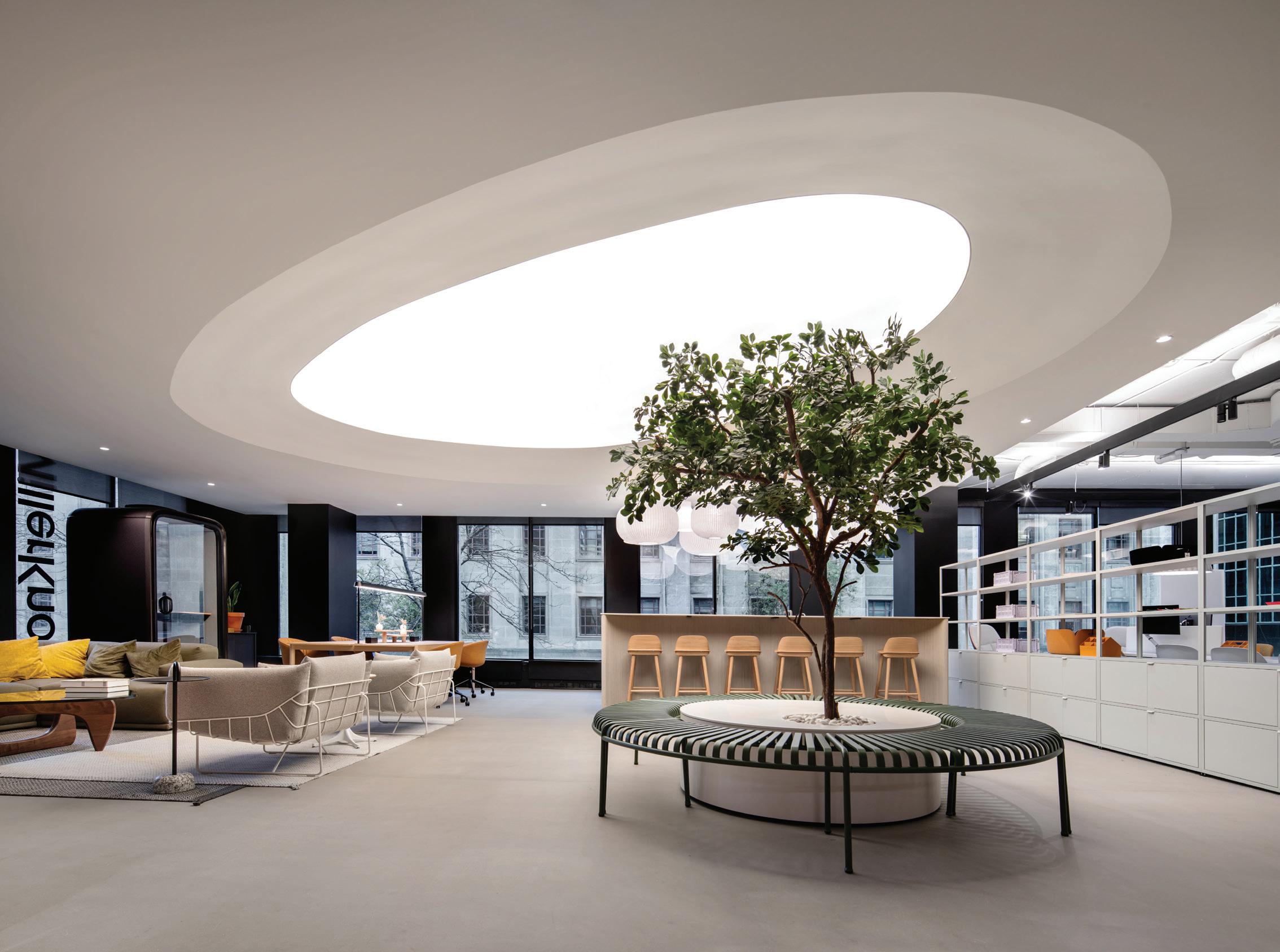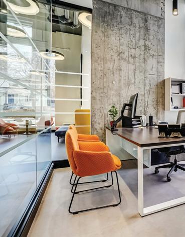 Burovision is both a showroom and an office – with features such as floorto-ceiling windows along three sides of the space and the choice to situate on the second-floor level allows employees and guests to enjoy nature and light from this tree-lined vantage point. The 9,200-square-foot environment is divided into a series of different work or hospitality points across the length of the space, intentionally flowing into one another while demonstrating a variety